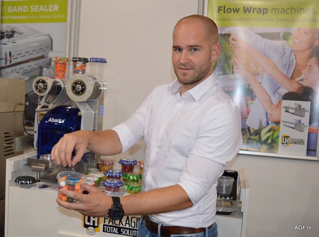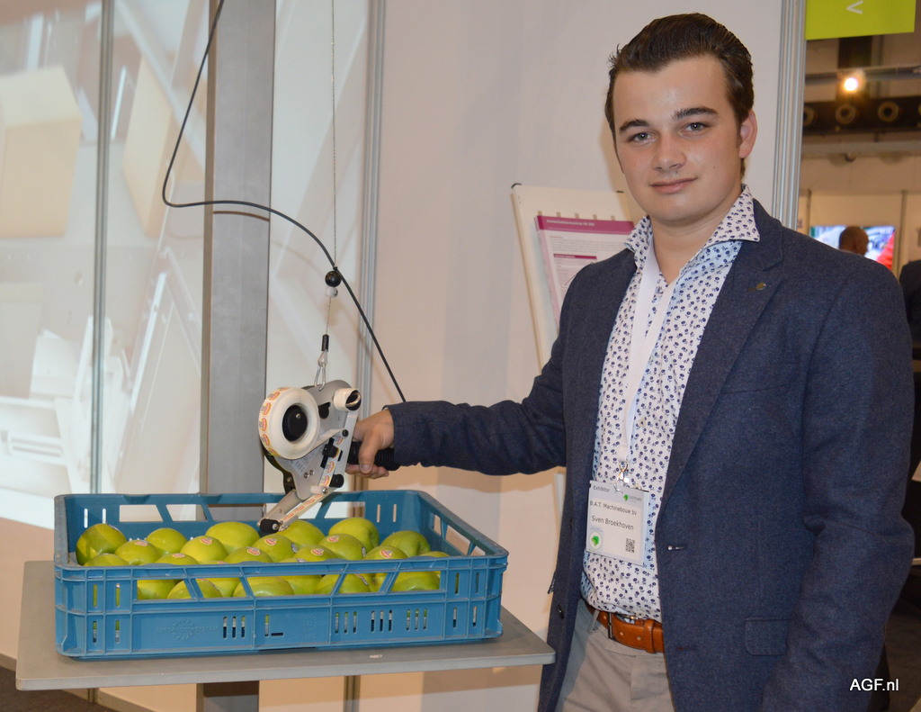Sven Broekhoven van B.A.T. machinebouw poseert bij de handetiketteermachine. Voordeel van dit apparaat is dat het onder verschillende hoeken kan etiketteren. Er wordt niet met lucht gewerkt en is heel snel. De etiketrollen zijn gemakkelijk verwisselbaar en er kan met etiketten tot 50 mm worden gewerkt.
