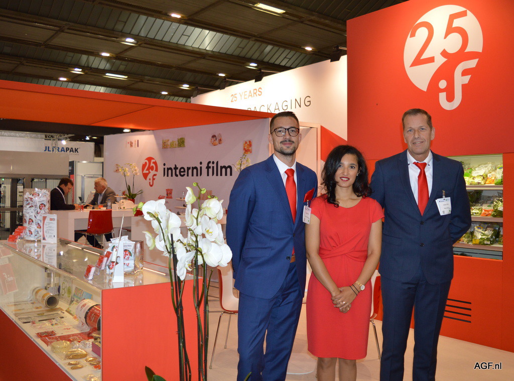Jubilaris Internifilm bestaat 25 jaar, Stijn Verreet, Gabriela Vercammen en Hans Berk. Internifilm is al 25 jaar leverancier van flowpack- en topsealfilm, bedrukte laserperforatie en hot needle perforation. Door de folies van laser perforatie te voorzien, wordt groenten en fruit langer houdbaar. Voor elk type groente en fruit kan worden berekend hoeveel gaatjes de verpakking nodig heeft en bereiken zo de ultieme houdbaarheid van uw product. Interni Film levert verschillende types folie met een anti-fog laag aan. Deze laag zorgt ervoor dat er geen waterdamp ontstaat aan de binnenzijde van de verpakking, waardoor het product steeds mooi zichtbaar blijft. Anti-fog folies zijn zowel beschikbaar voor flow pack (BOPP folie) als voor het top-sealen van CPET/APET/MAPET bakjes (PET folie) en PP bakjes (laminaten). Deze verschillende folie types kunnen ook bedrukt geleverd worden.
