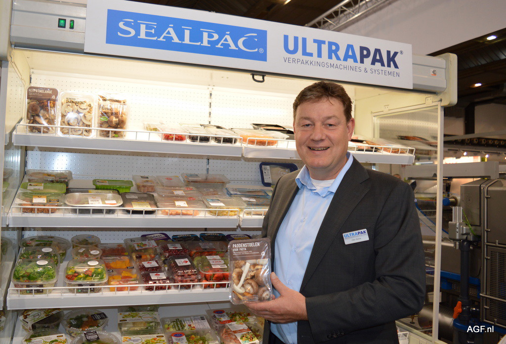 Ultrapak verpakkingssystemen. Olav Sinke toont een paddenstoelen verpakking. Voor dit product wordt steeds meer topseal gebruikt. Het product blijft zo rondom mooi zichtbaar.