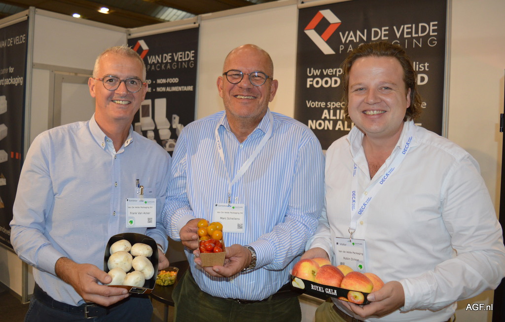 Frank van Acker, Marc Schellens en Robin Dirkse van Van de Velde Packaging. Zij leveren massief- en vouwkartonnen verpakkingen. Kartonnen schalen zijn geschikt om te topsealen, zijn luchtdicht en onder vergassing blijft het product langer vers.