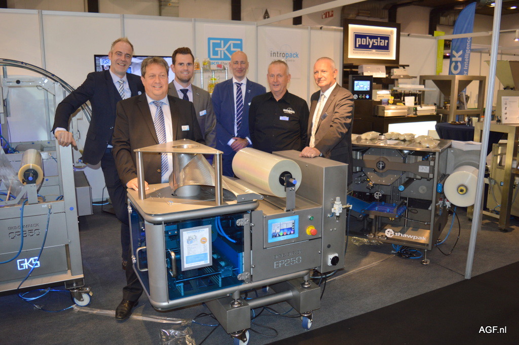 GKS, Intropack en FoodLife gezamenlijk in een stand. Het team poseert voor de Easypack EP 250 verticale, vorm, vul en sluitmachine. De machine is geschikt voor het kleinschalig verpakken van Pillobag verpakkingen. De machine is compact, snel wisselen van productieruns en heeft een extreem lage valhoogte. Bij handmatige invoer van het product is de capaciteit zo'n 20 verpakkingen per minuut.