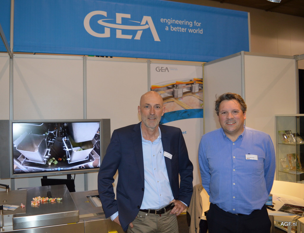 Guy Verduyckt en Christophe Devillé. GEA is leverancier van verticale flowpackers voor bv het verpakken van spruiten. Op de beurs werd een film getoond.