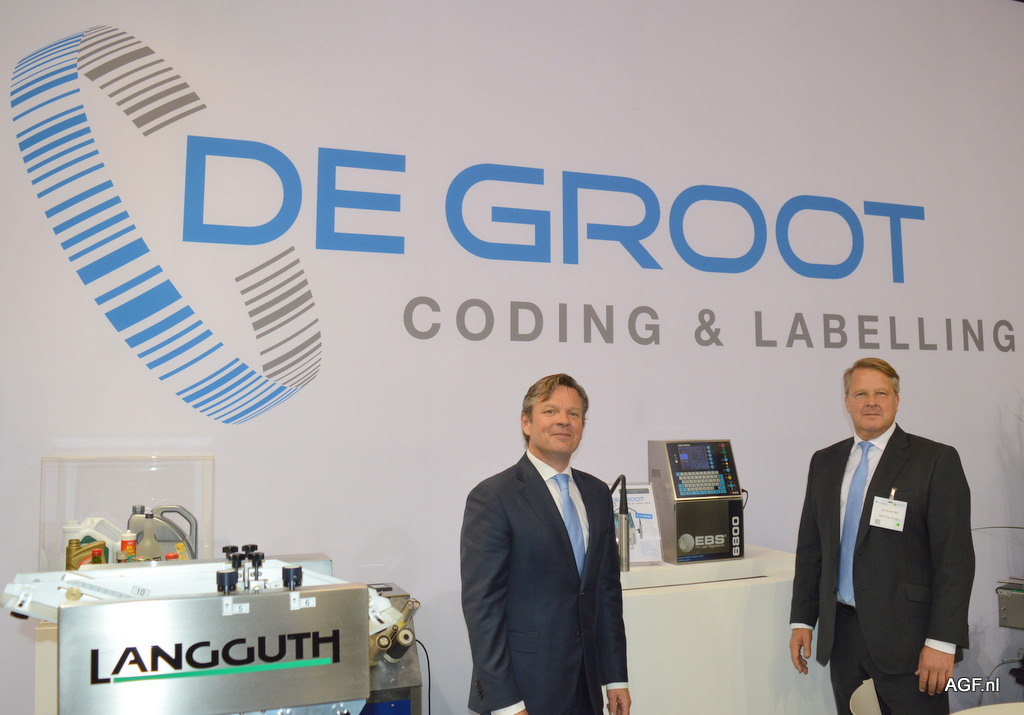 Thimo de Wit en Bert de Groot van De Groot Coding & Labeling poserend bij de EBS-6800 inkjet printer. Deze printer is spatwaterdicht, zuinig in gebruik, toepasbaar in de AGF sector voor het printen van bv houdbaarheidsdatum en batchnummers.