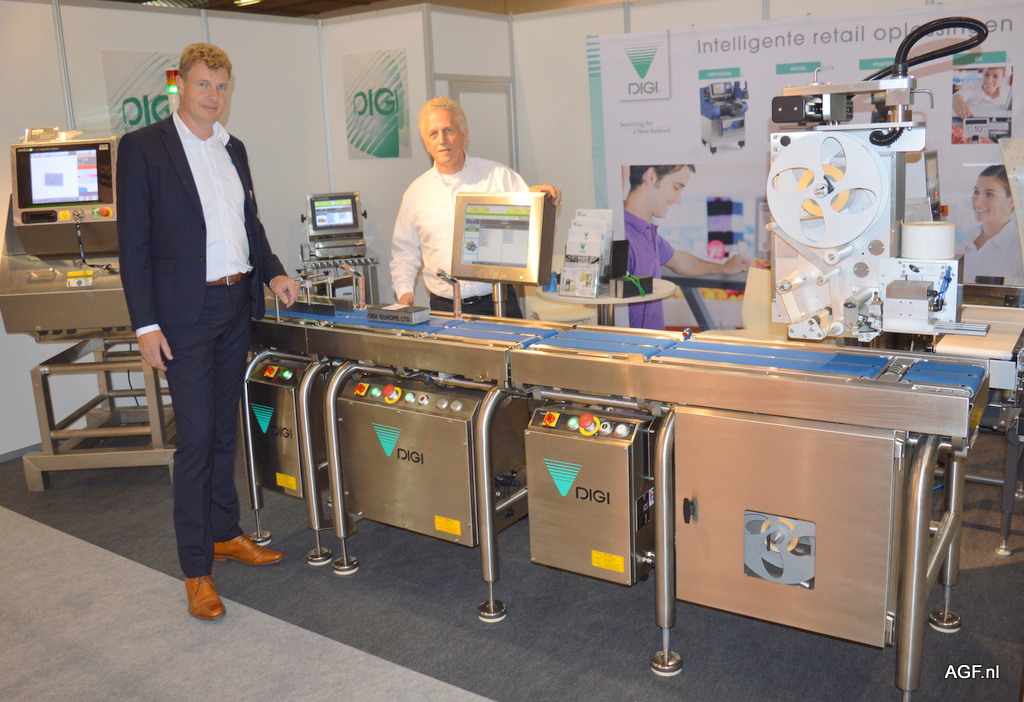 Digi Europe Ltd, Olaf de Haan en Paul Wiggen bij de HJ 700-H5 high speed weeg- en etiketteermachine. Hoge snelheid tot 160 schaaltjes/min. Het is een nieuw model machine die geschikt is voor tomaten, zachtfruit etc.