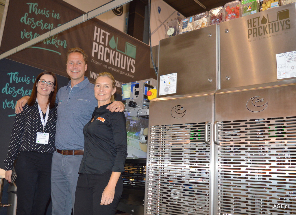 Het Packhuys, leverancier van doseer- en verpakkingssystemen. Pierre Hagenaars geflankeerd door Daniela van het Italiaanse bedrijf Valcko, een bedrijf dat kleine topseal machines ontwikkeld en Caroline van Keymac, een Engelse leverancier van kartonneermachines.