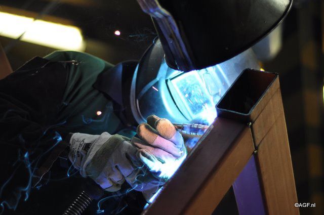 De lasser is aan het werk aan een stevige constructie waarop een installatie geplaatst kan worden