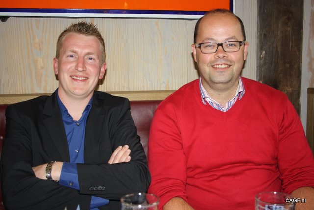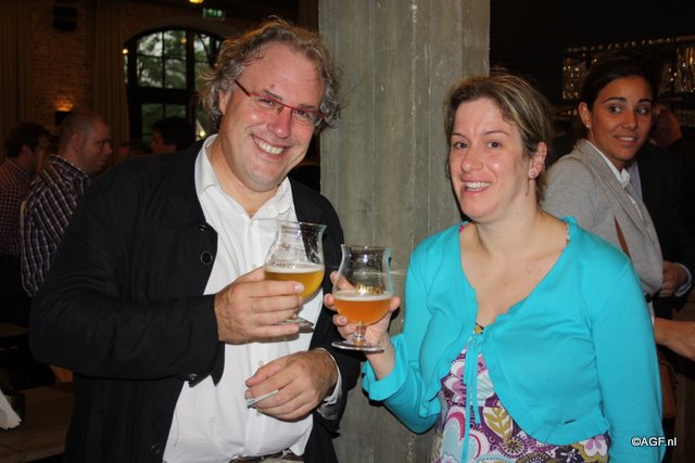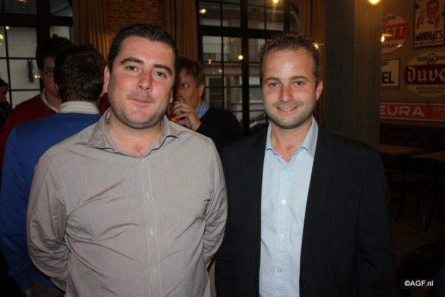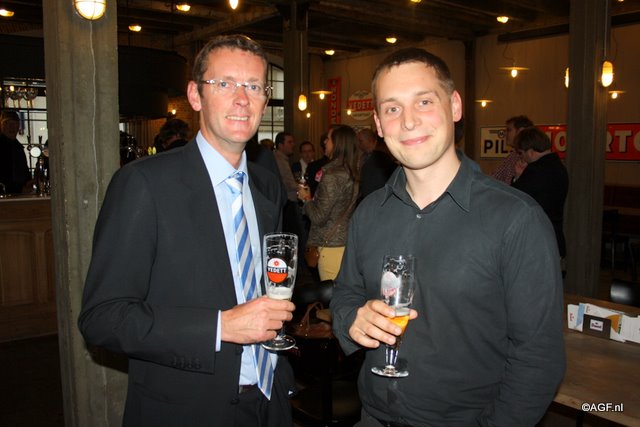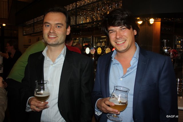 Gezellig aan een biertje. Links Steve De Backere van D'Arta en rechts Filip Wallays van Agristo