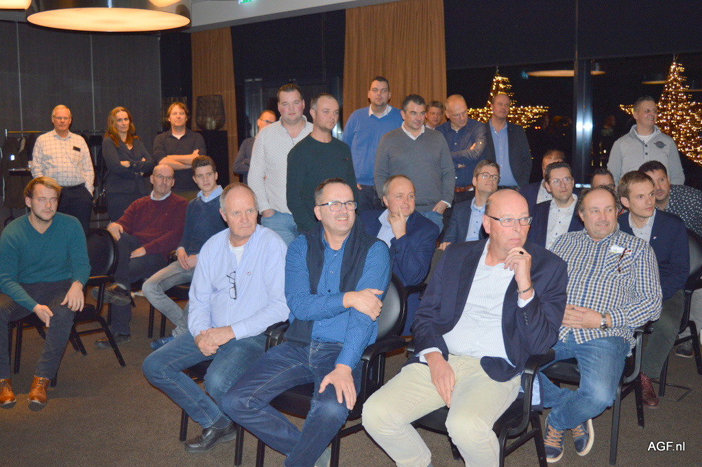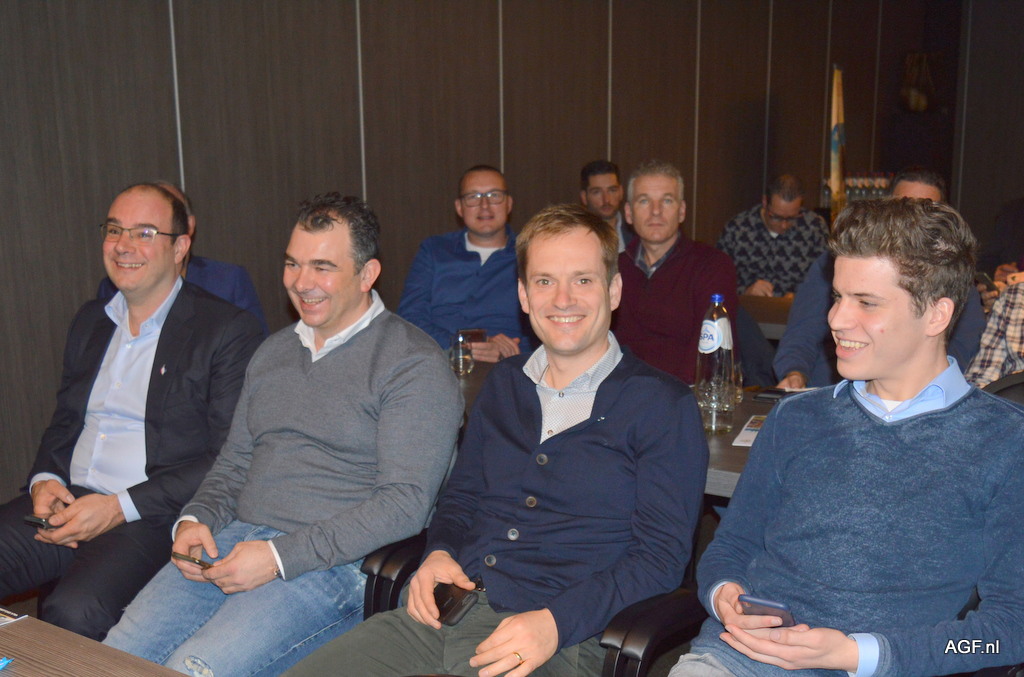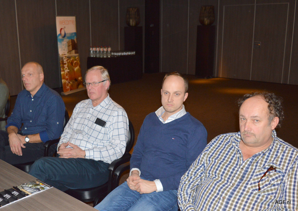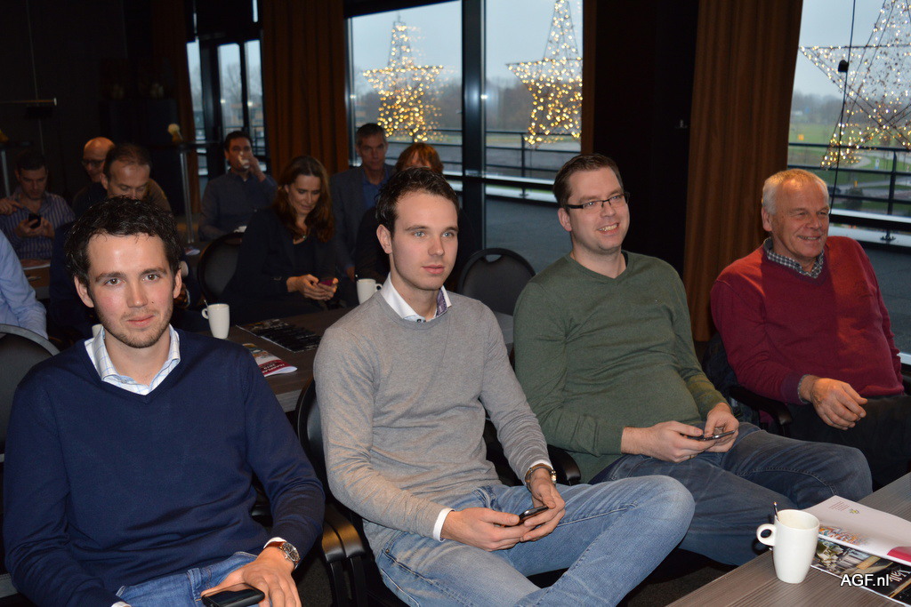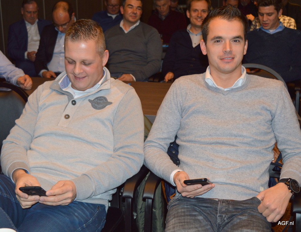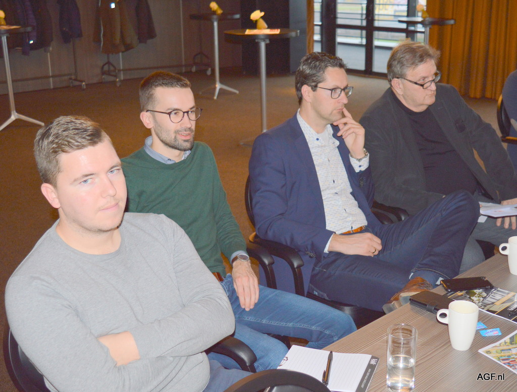 Martijn en Maarten van Damme en Evert Jan Eerland van Dacomex en de enige boer in de zaal: Jaap de Zeeuw