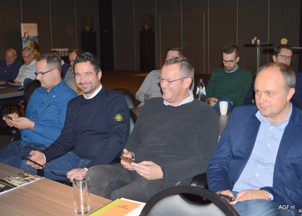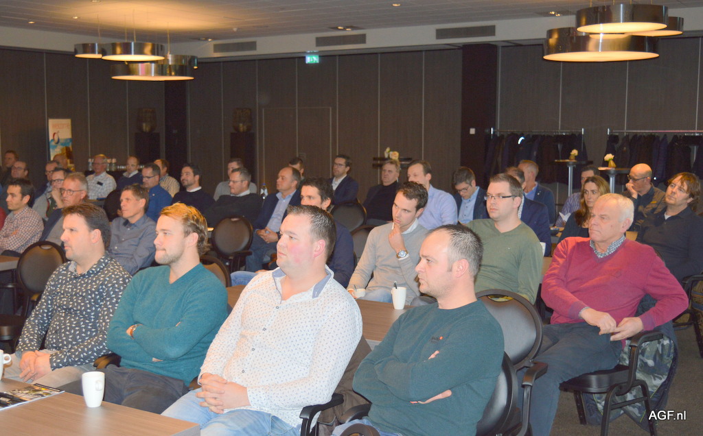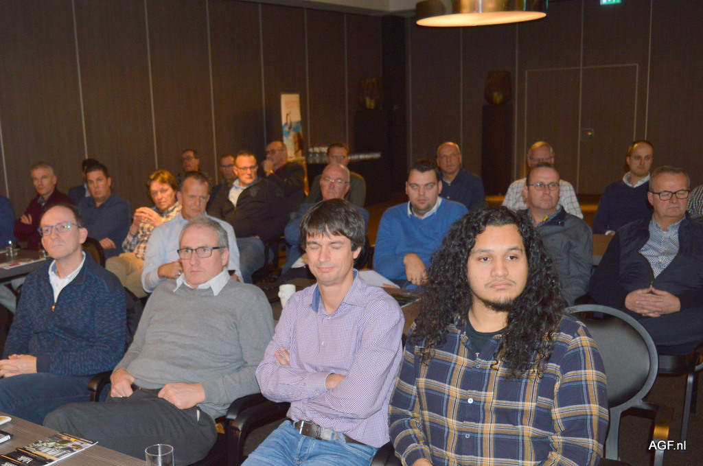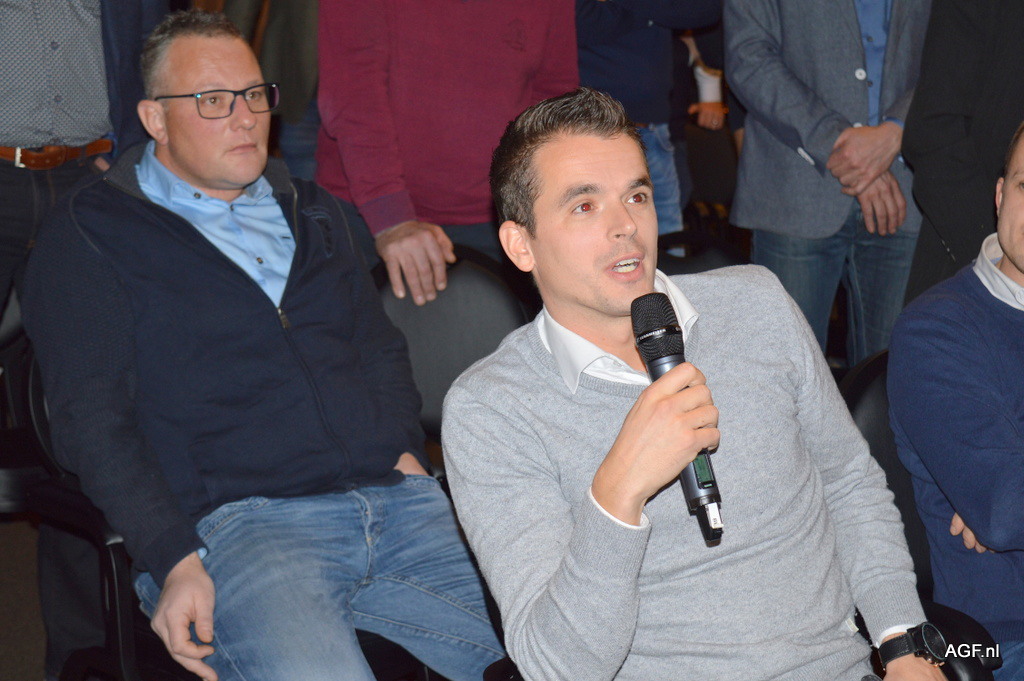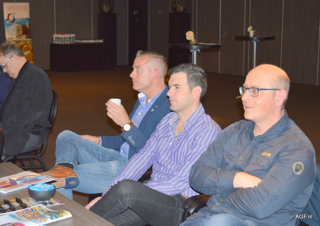 Martijn en Maarten van Damme en Evert Jan Eerland van Dacomex en de enige boer in de zaal: Jaap de Zeeuw