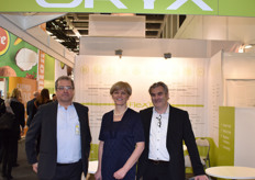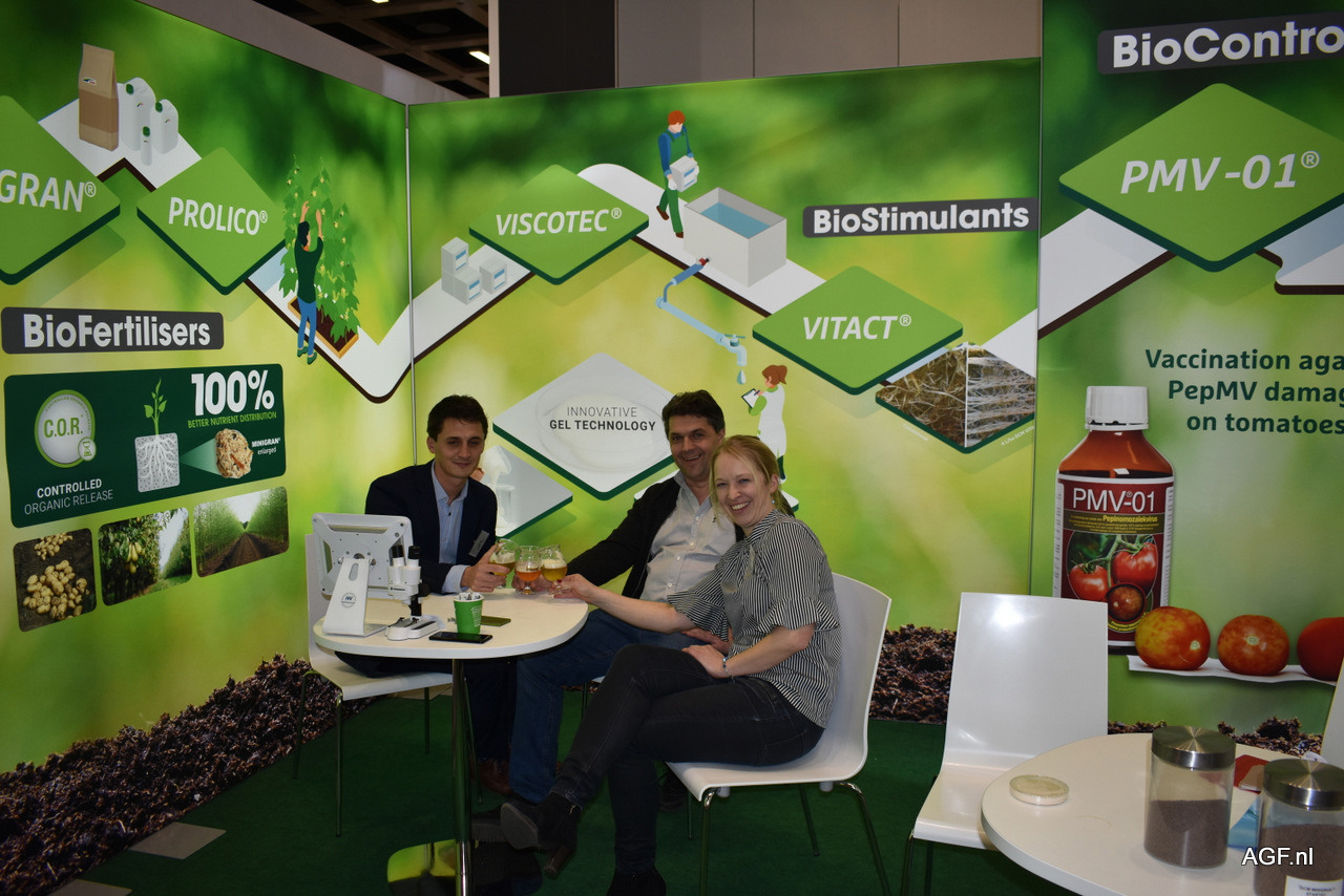 Annelies Juste, Thijs De Langhe en Kurt Lauwers van DCM. Het bedrijf was genomineerd met de Viscoter Blue Bio vloeibare meststof voor de innovation award van de Fruit Logistica 2019.