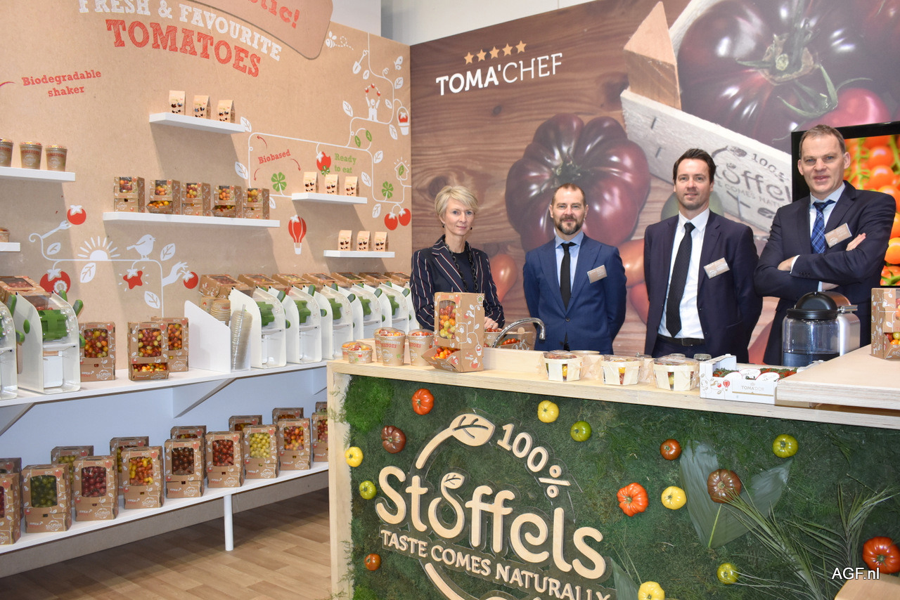 Petra en Paul Stoffels, Peter van Rijn en de nieuwe aanwinst van Stoffels Tomatoes – Gert Gaukema. Stoffels zet al jaren sterk in op het reduceren van plastic. Bijna alle verpakkingen die gebruikt worden zijn composteerdbaar of recyclebaar.