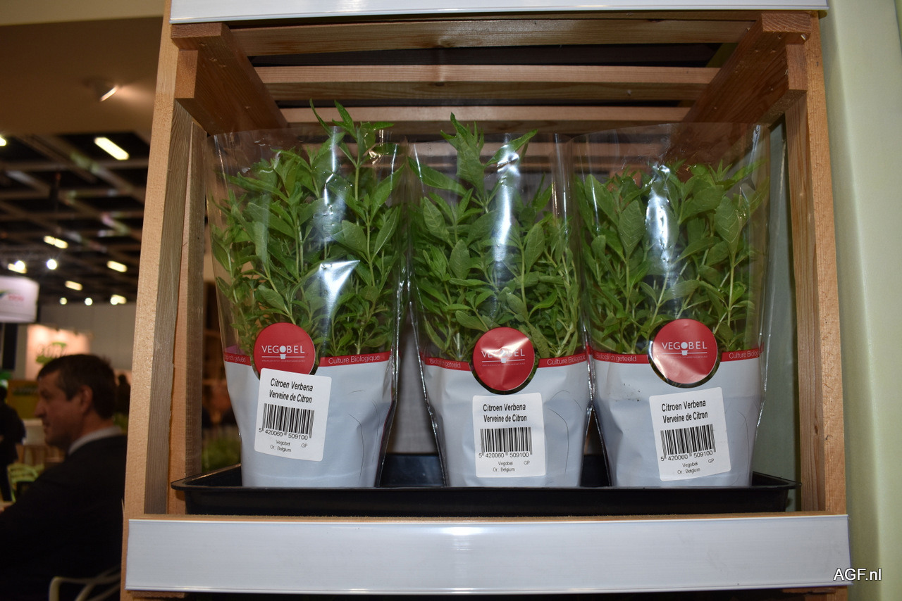 Isabel en Steven Lauwers van Vegobel. Het kruidensegment groeit hard net als de markt voor eetbare bloemen. Citroen verbena is een kruid die de laatste tijd steeds populairder wordt. Alles kruiden die Vegobel teelt zijn biologisch.