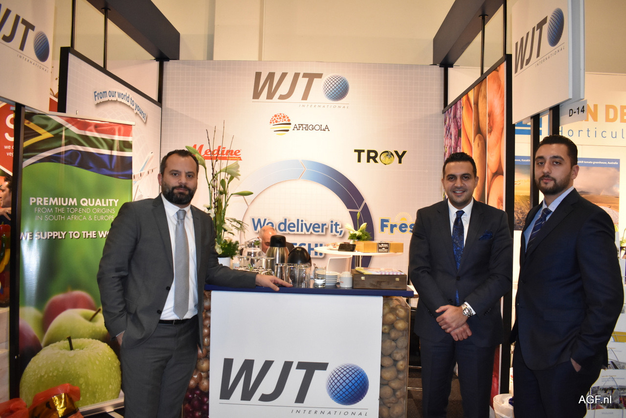 Karym en Wissam Charwani en Nader Jouni van WJT. In het afgelopen jaar is het bedrijf 30% gegroeid qua export. Ze hebben een nieuw gekoeld magazijn in Essen gebouwd voor een mix van fruit.