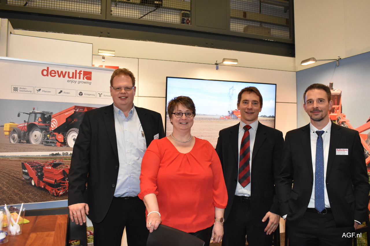 Frits en Ine Schlimbach, Vincent Holvoet en Bartusch Stanek van Dewulf. Ze hebben een nieuwe rooier voor wortelen voor het lossen in kisten.