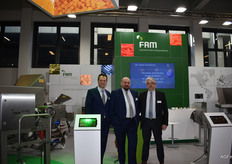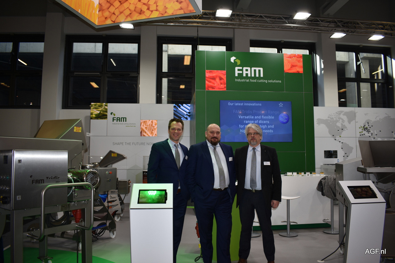 Stefan De Vreese, Sven Boen, Wilfried Rombauts van FAM en Stumabo. De bedrijven hebben op de beurs een nieuwe middelgrote capaciteit blokjes snijmachine geïntroduceerd.