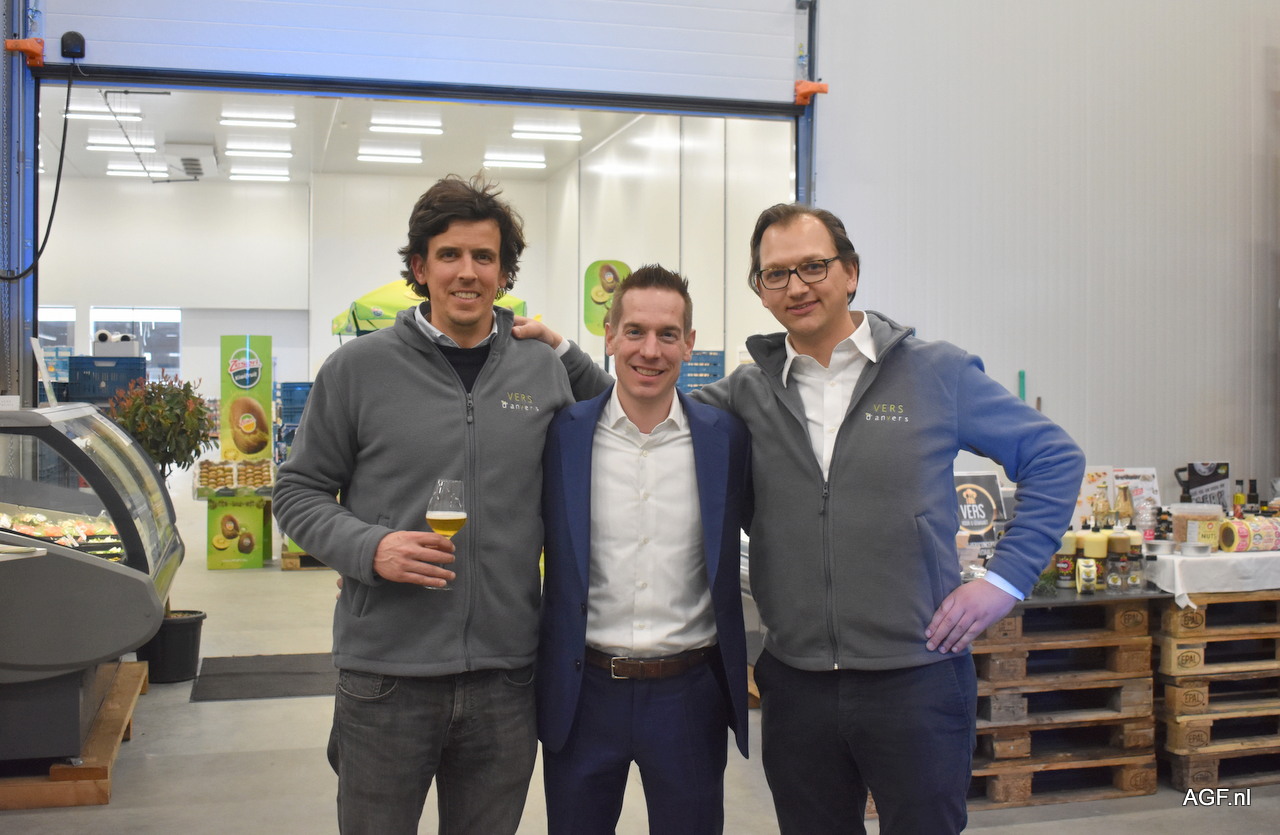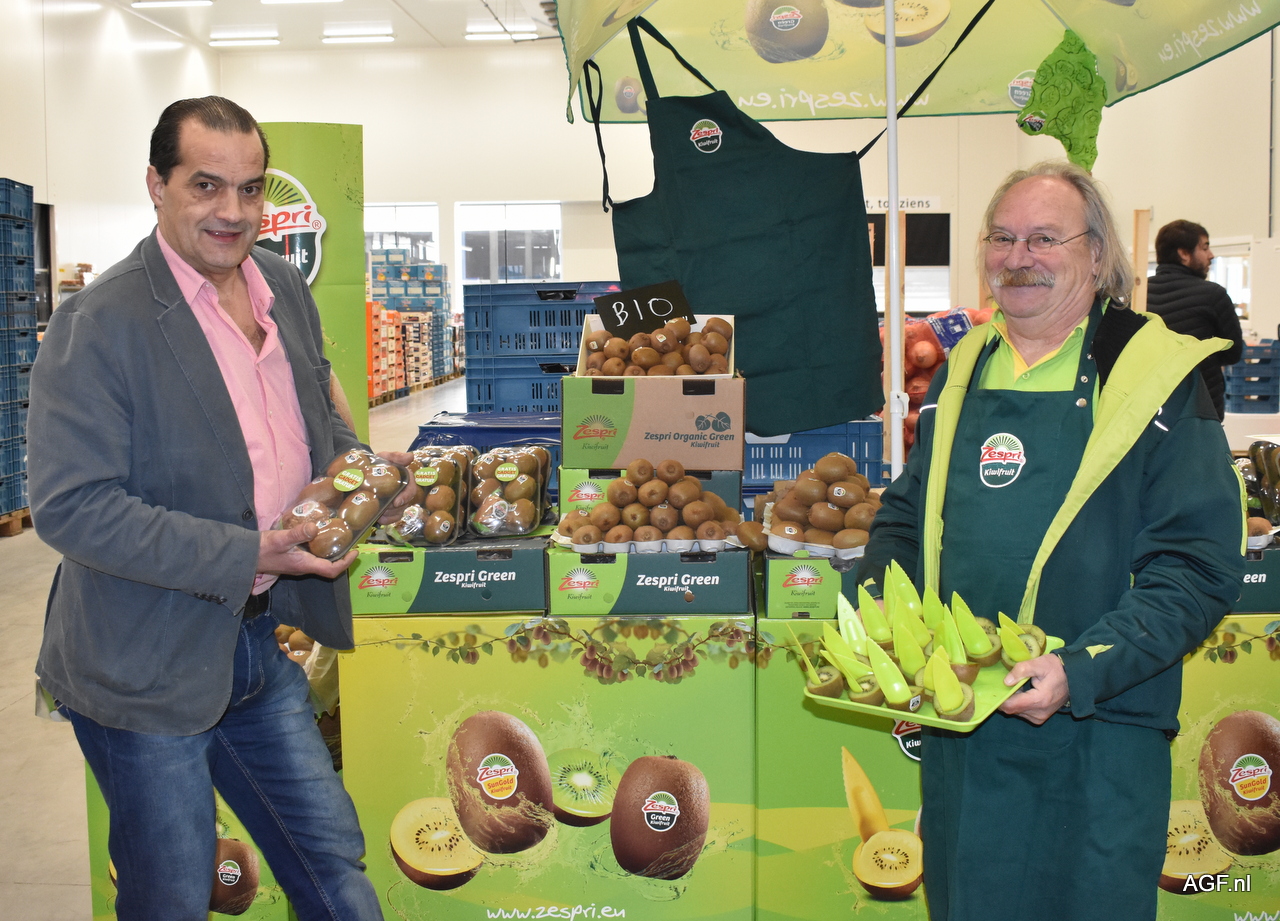 Ton Theunissen van Zespri en Dirk Dejaegere van Promoplan. De eerste kiwi's uit Nieuw-Zeeland zijn onderweg en komen begin mei aan in Zeebrugge. De volumes zijn dit jaar groter dan vorig jaar en voornamelijk de Sungold volumes zijn toegenomen.