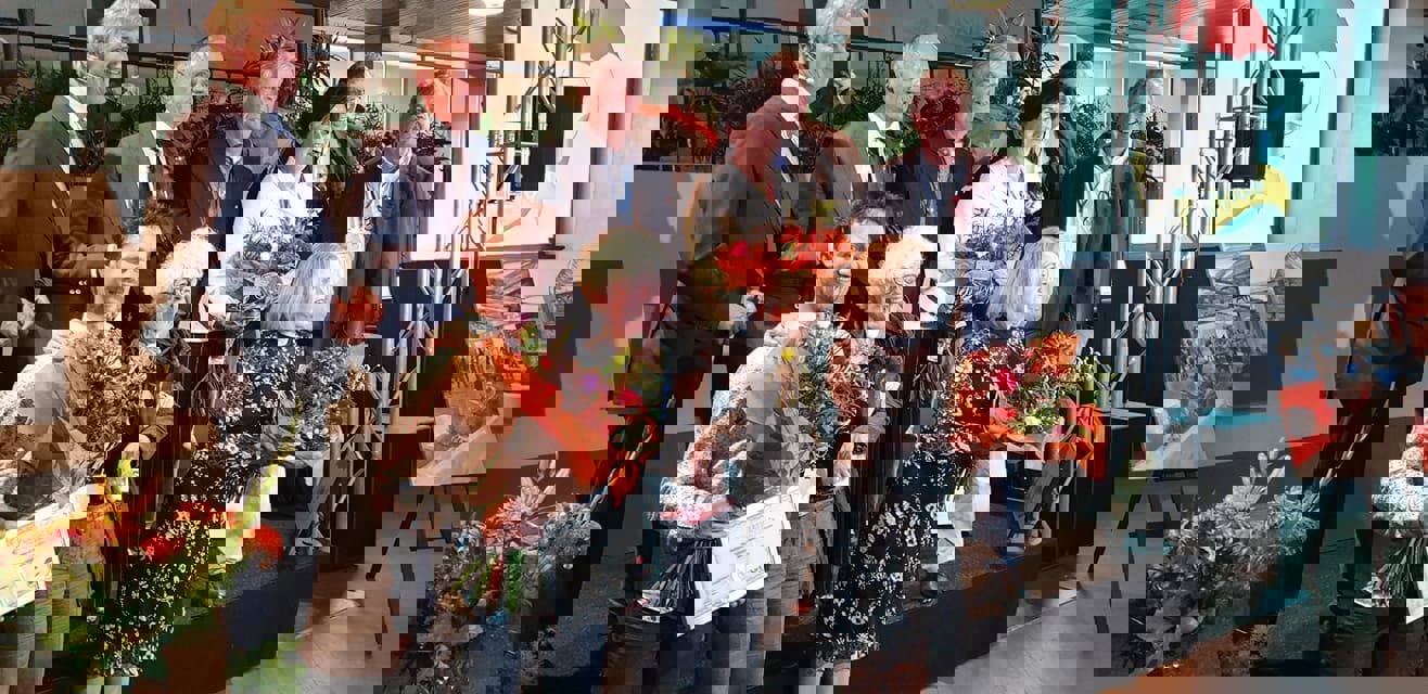 Winners of the Ambassador of the Mushroom Industry Award 2019 at the 35th Dutch Mushroom Days in Den Bosch; Magda Verfaillie, Johan Baars, Anton Sonnenberg, Ko Hooijmans and Jan Klerken with family and speaker Loek Hermans (left).