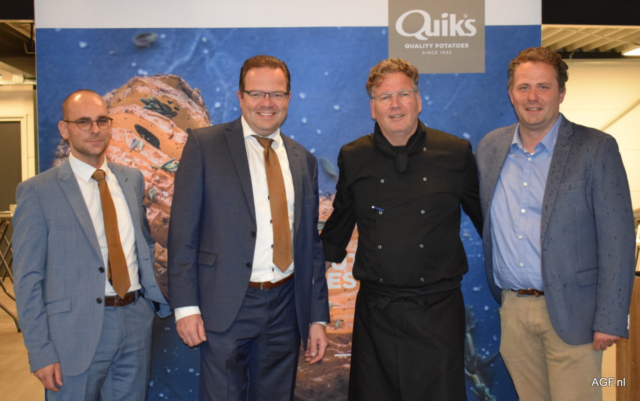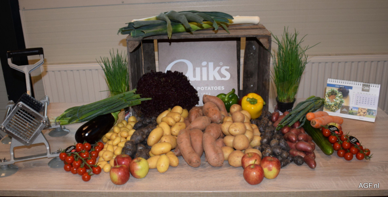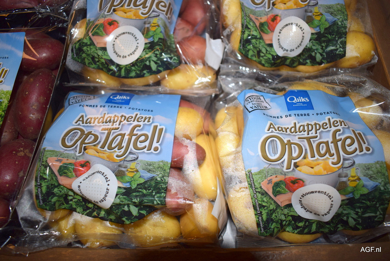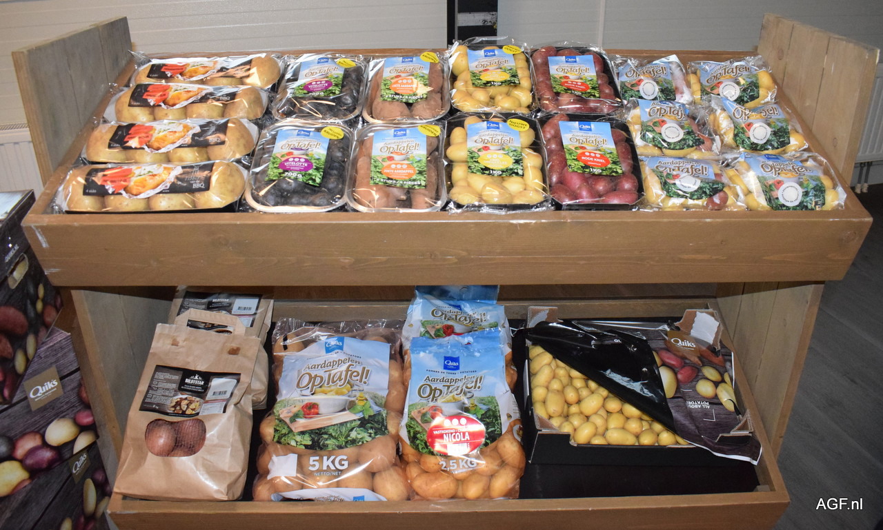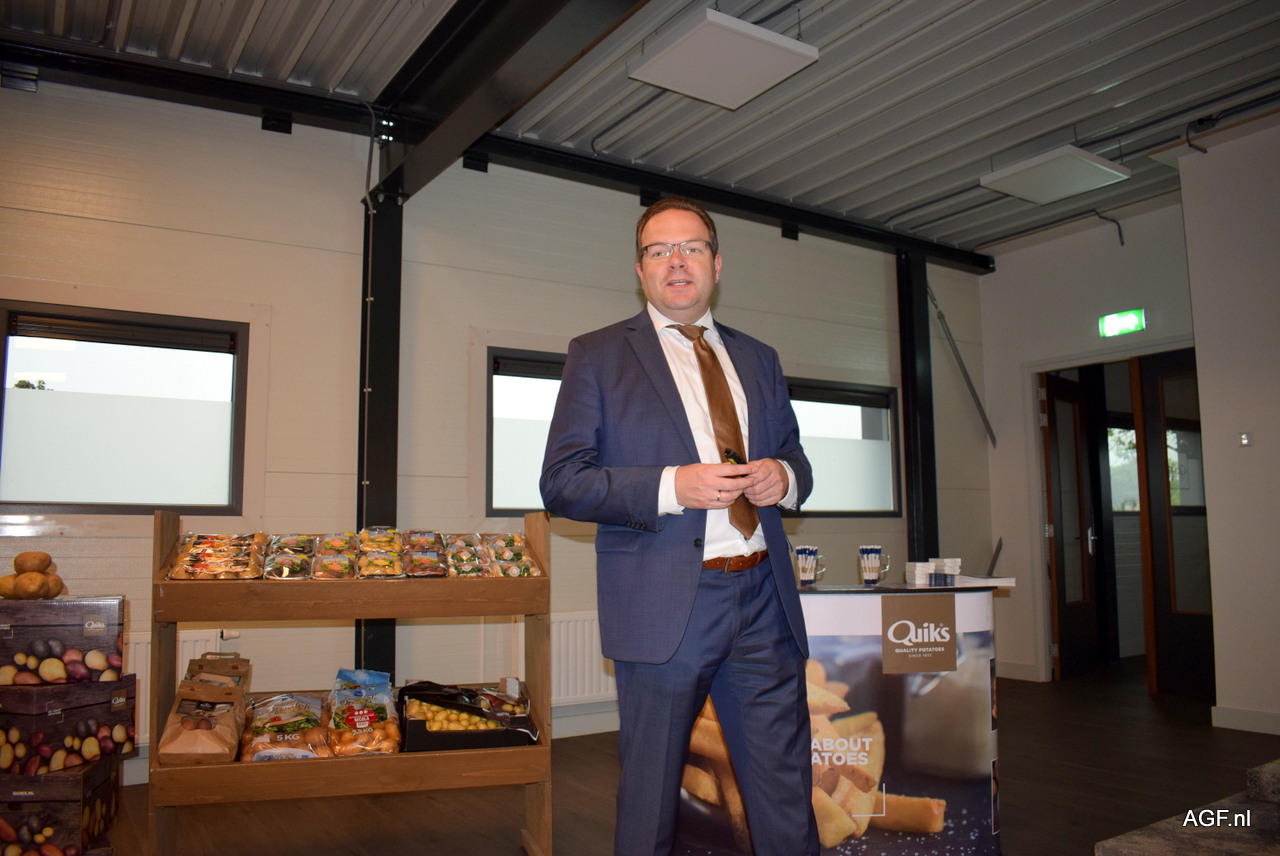 Wim Paans van Quiks vertelt bij zijn kraampje met aardappelen over het assortiment aan kleinverpakking