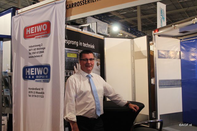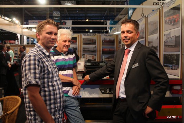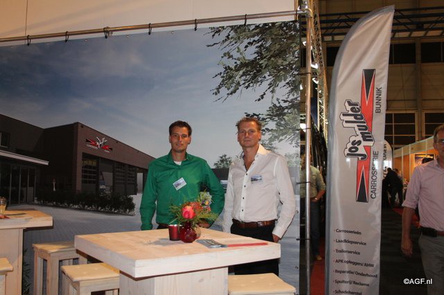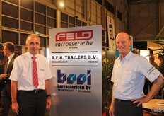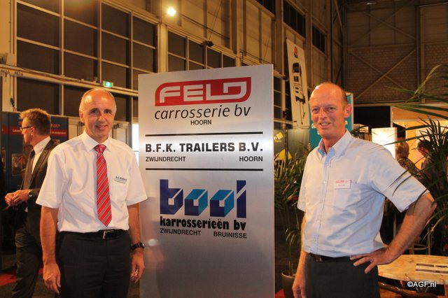 K. Groeneveld en Harry Feld op de gezamelijke stand van Feld Carrosserie, B.F.K. Trailiers en Booi Karrossieën.