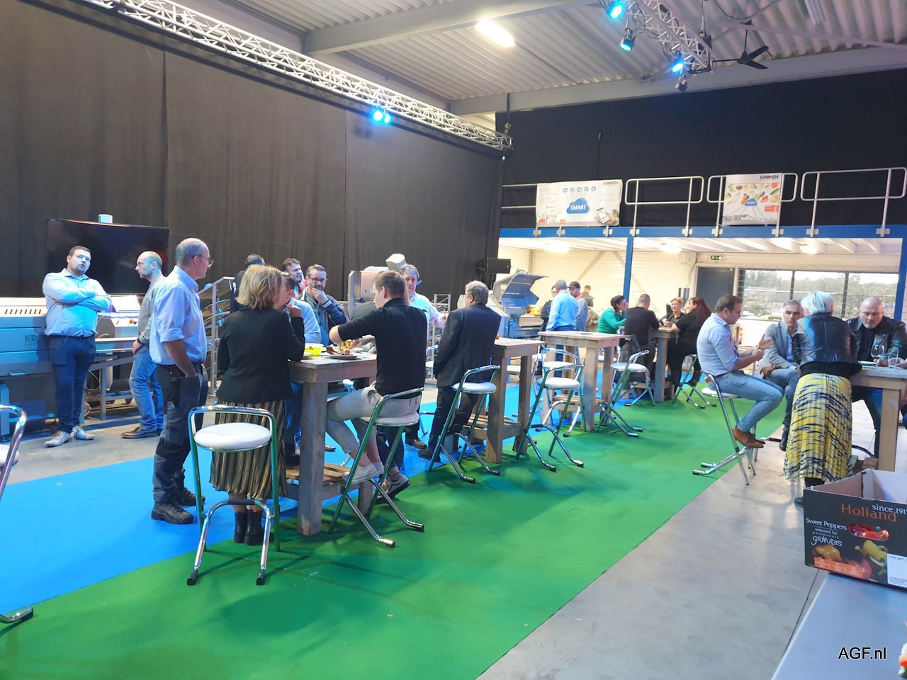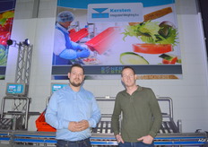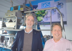GKS, Ivo Geukes en Roland Witvoet. Synergy is certified partner voor GKS. De heren poseren voor een verticale vorm, vul en sluitmachine. De machines zijn geschikt voor alle gesneden groenten, sla, wortels, prei, paprika enzovoort. Ook had GKS de Minipack 150 meegenomen. De machine wordt gebruikt voor kleine verpakkingen om dressings af te vullen voor het bijvoegen in kant en klare salades. De machines kunnen worden uitgerust met een pomp voor het afvullen van vloeistoffen.