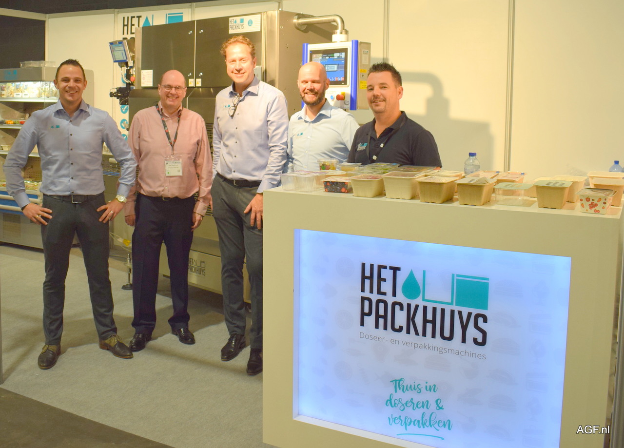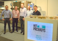 Het team van het Packhuys, van links naar rechts: Jan Molenaar, Michael Woods (leverancier Keymac), Pierre Hagenaars, Chiel Jordans en Rick van Helden. Verdeeld over twee stands was Het Packhuys goed aanwezig. Op de stand stond onder andere de Keymac sleever, deze gebruikt 100% duurzaam karton.