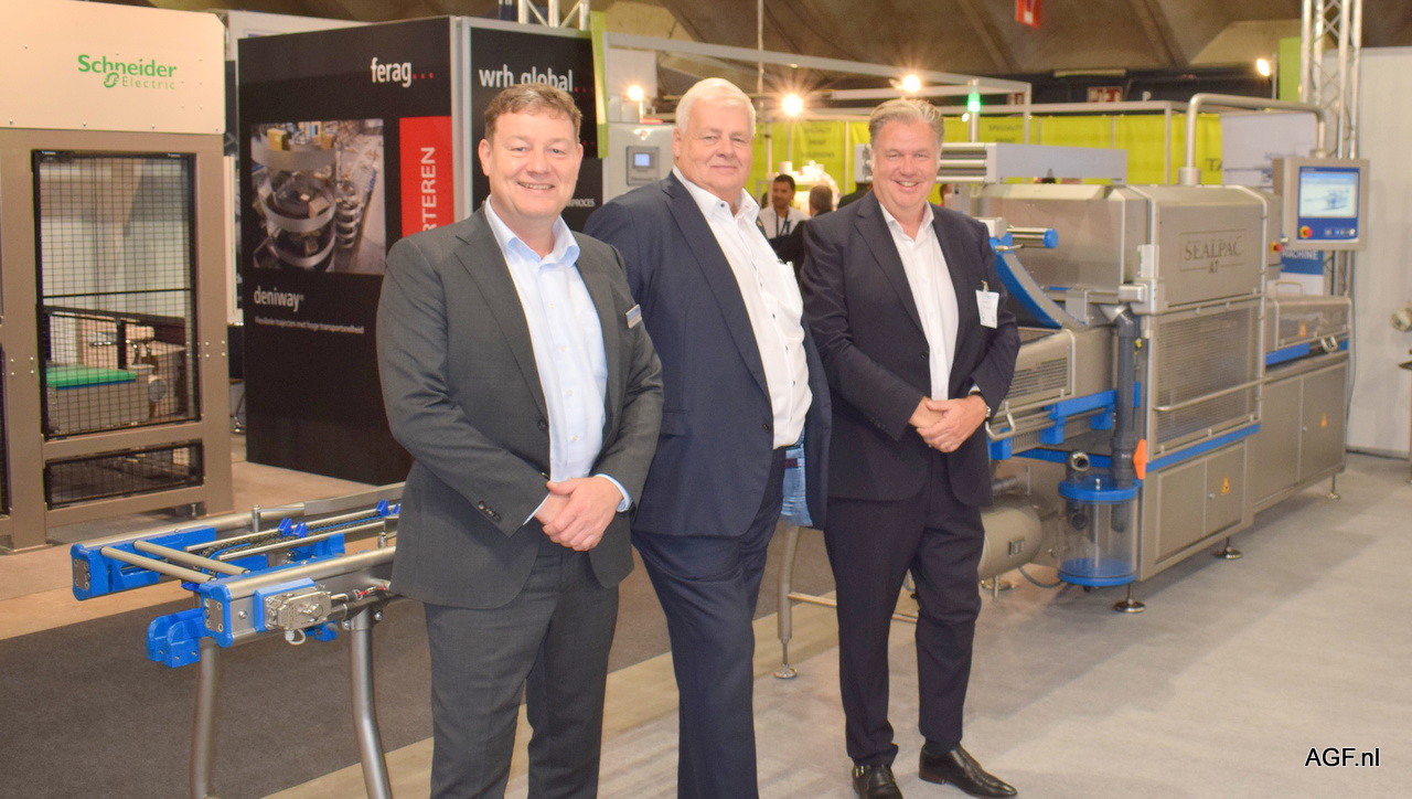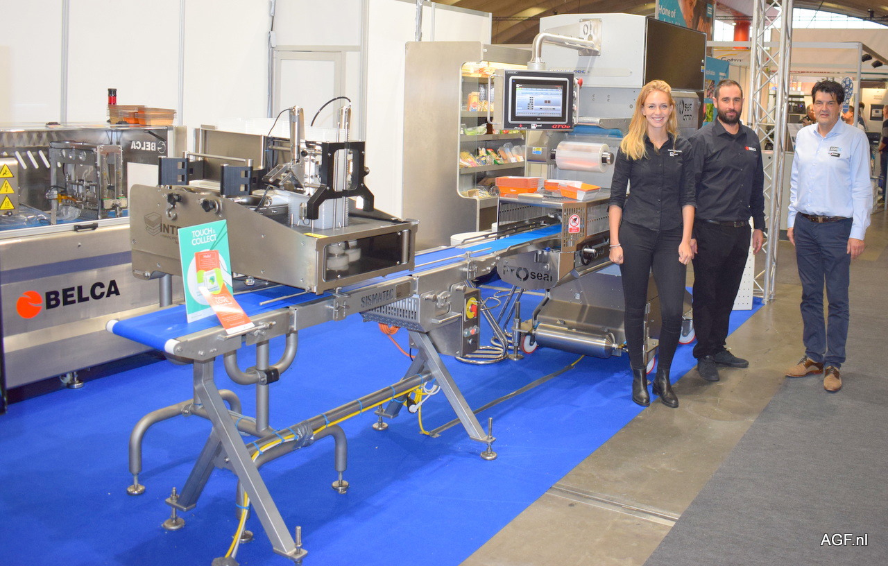 Dianne Bouman (l) en Gerard Bas van Sismatec. Arkaitz Erro (m) is van Belca, partner van Sismatec. Naast hun de nieuwste seal machine, die een totaal oplossing biedt voor de klant.