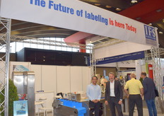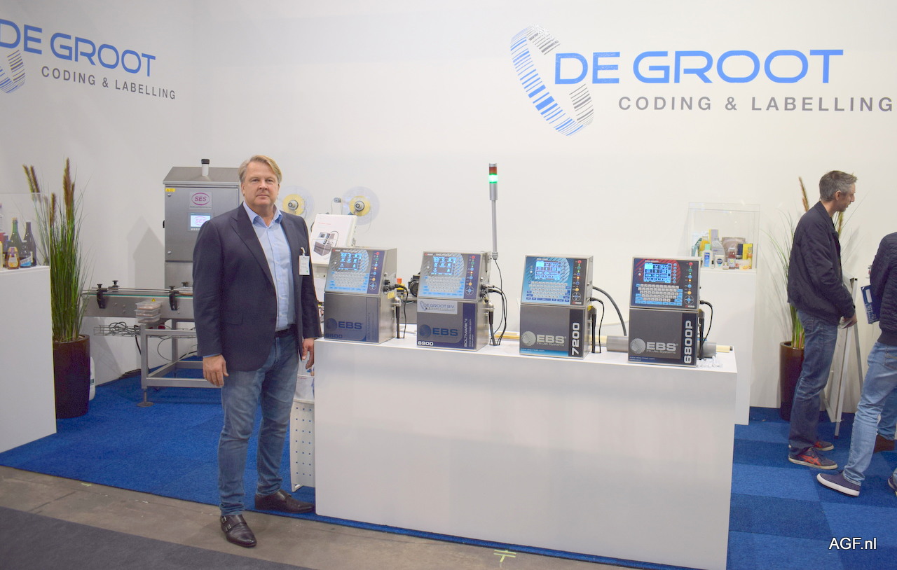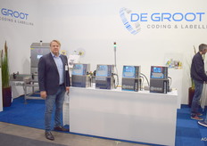 Bert de Groot van De Groot coding en labelling. Bert staat naast de nieuwe printer range, die spatwaterdicht zijn en nu ook in diverse kleuren kunnen printen.