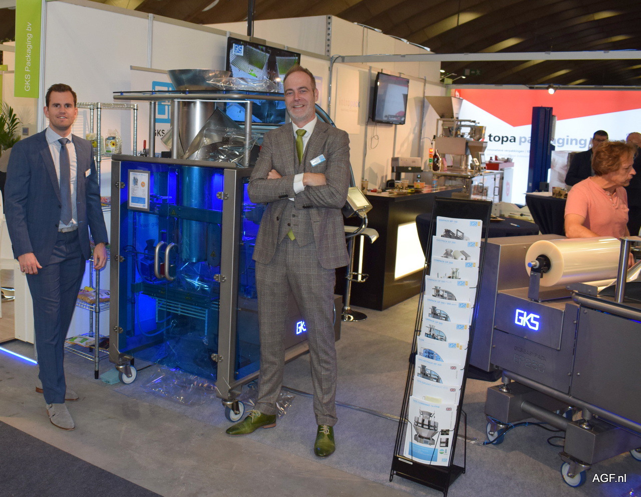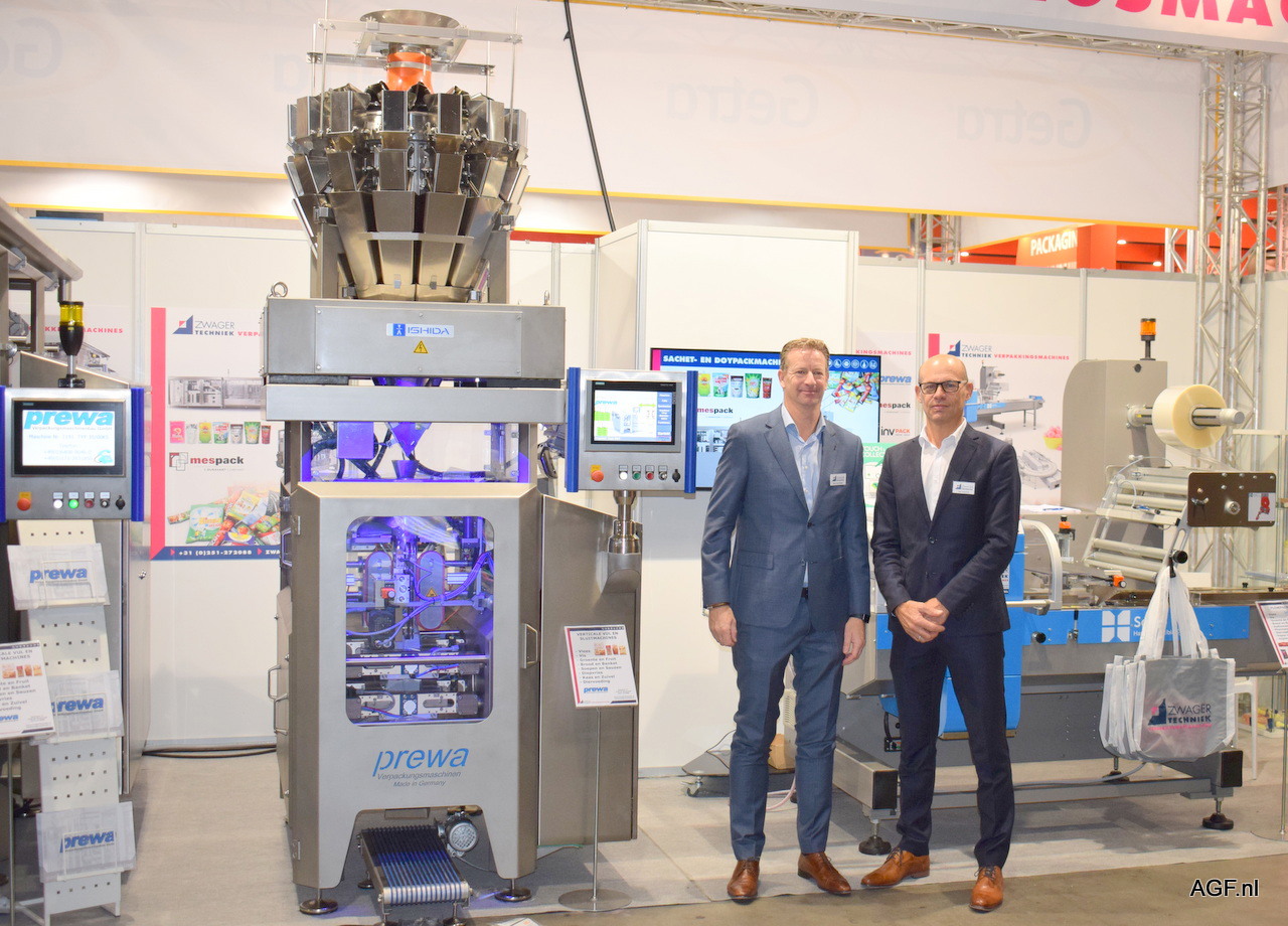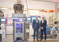 Dennis Kuijpers en Ivo Geukes van GKS Packaging poseren naast de servo-gestuurde verpakkingsmachine UP350. Ivo geeft aan dat deze verticale vorm-, vul-, en sluitmachine steeds vaker verkocht wordt in de AGF-sector.