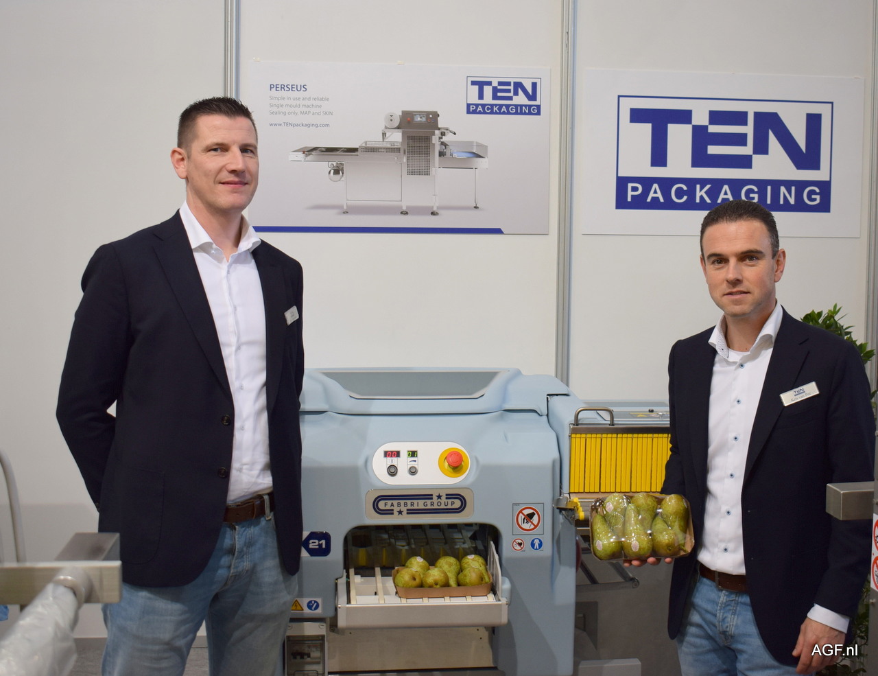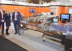 Eric Suiskens en Kris van Pee poseren naast de Elixa 21 van Ten Packaging. De Elixa 21 wordt gebruikt voor het verpakken van versproducten op schaal. De machine wordt gebruikt voor het rekfolie verpakken in supermarkten en slagerijen.
