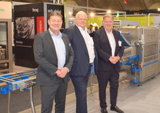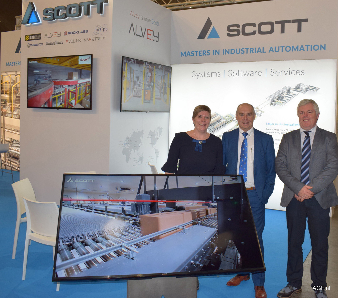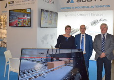 Aurélie van Accolyen, Guido Vermeiren en Johan van der Eecken van Scott. Scott introduceerde de nieuwe generatie palletiser. Deze heeft een betere gebruiksvriendelijkheid, hogere capaciteit en een strak design.