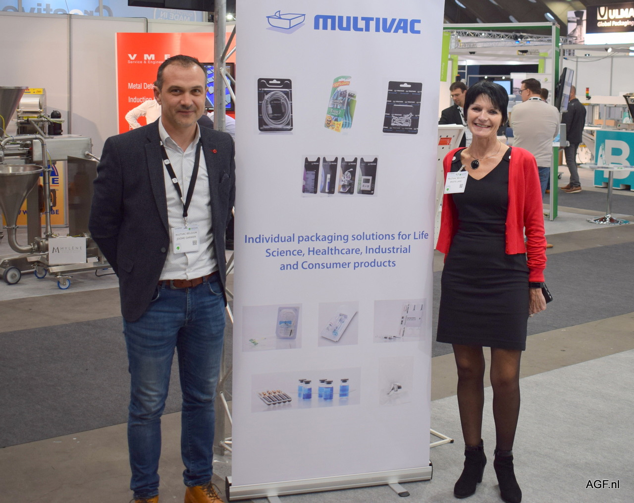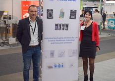 Cofnier Jérôme en Kristel Jans van Multivac. Multivac promoten de nieuwe verpakking paperboard. De paperboard verpakking is geproduceerd met recyclebaar materiaal gebaseerd op papiervezels.