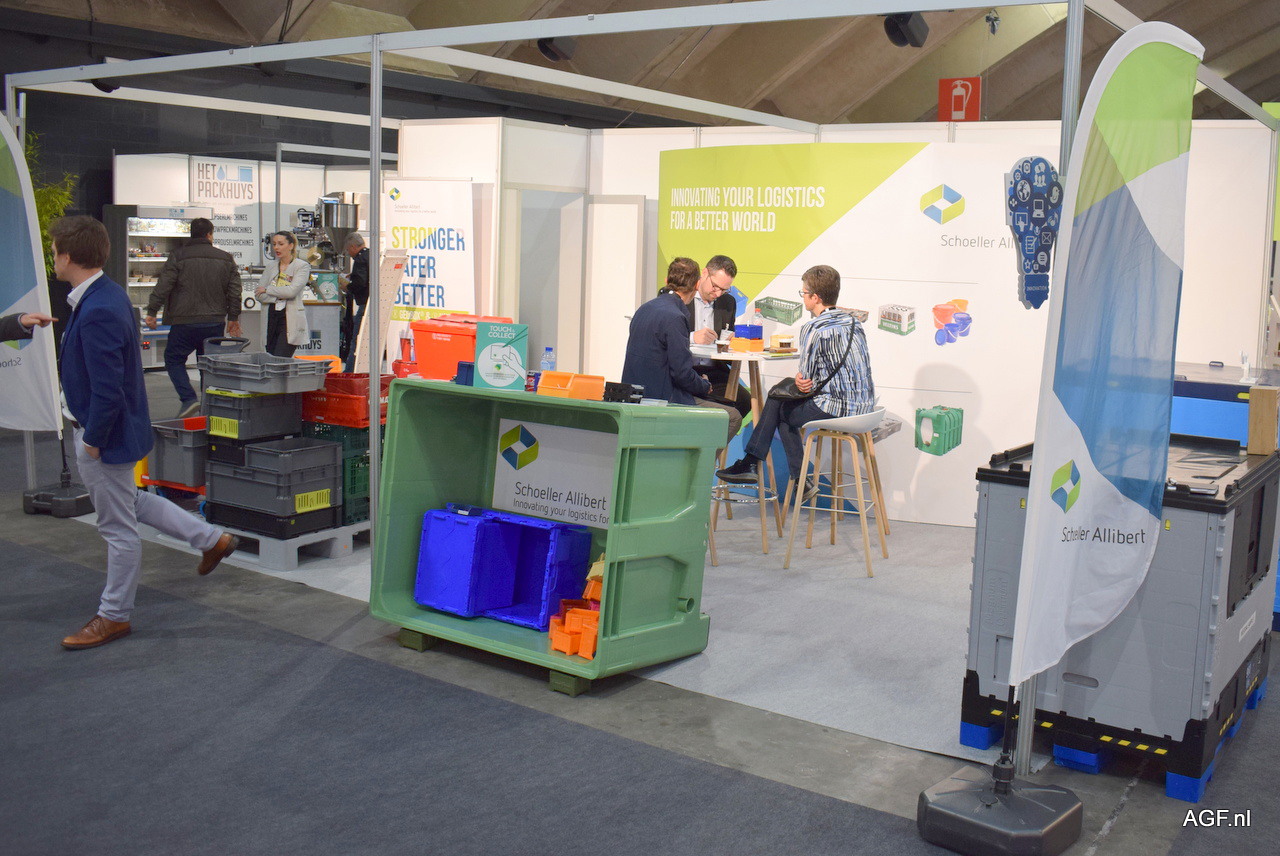 De stand van Schoeller Allibert. Schoeller Allibert ontving tot twee keer toe een innovatie award op de Empack, de Magnum Optimum 1208 en de Packaging Award voor Combo Excelsior.