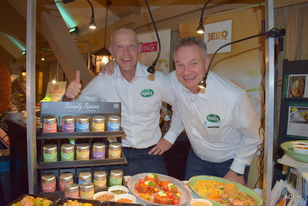 Jos van Epos en zijn collega Martin Hoogvliet met een kruidenlijn zonder E-nummers en veilig voor 24 allergenen. Te gebruiken in stamppot, salades, op aardappelen en friet.