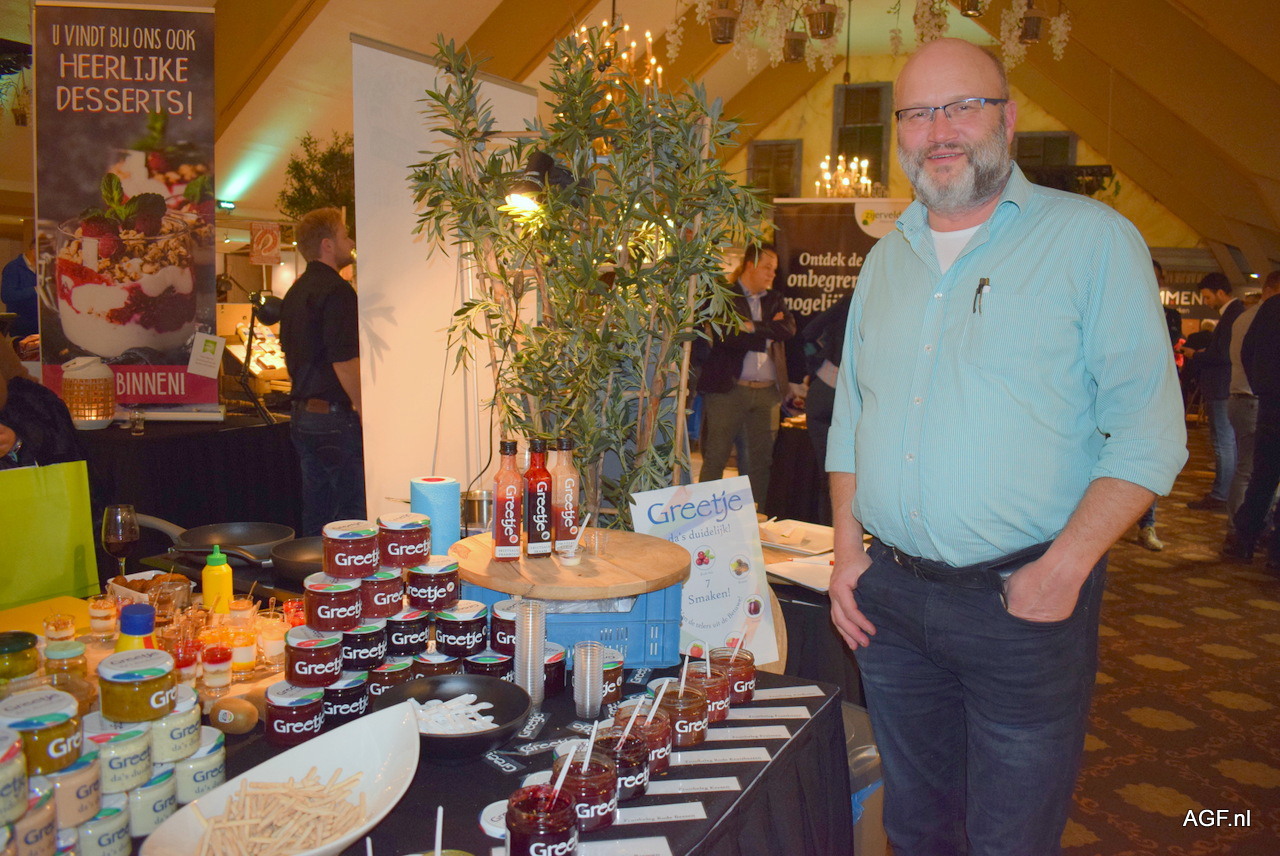 Sipke Nieuwenhuis met Greetje producten, 7 soorten fruitbeleg gemaakt van ‘restfruit’ van telers uit de Betuwe. “Hiermee willen we de Betuwe weer terugbrengen op de Nederlandse keukentafel”, aldus Sipke.