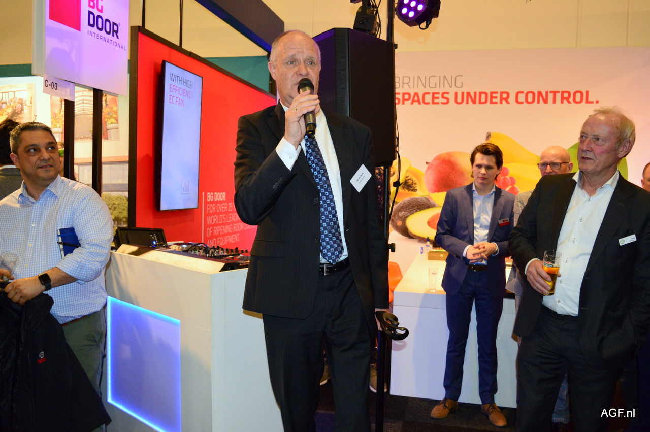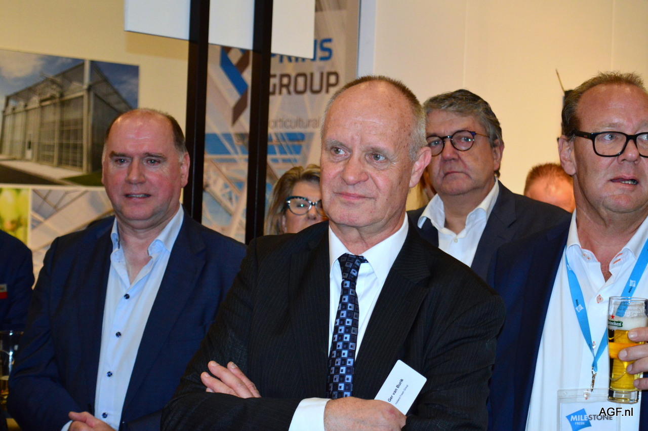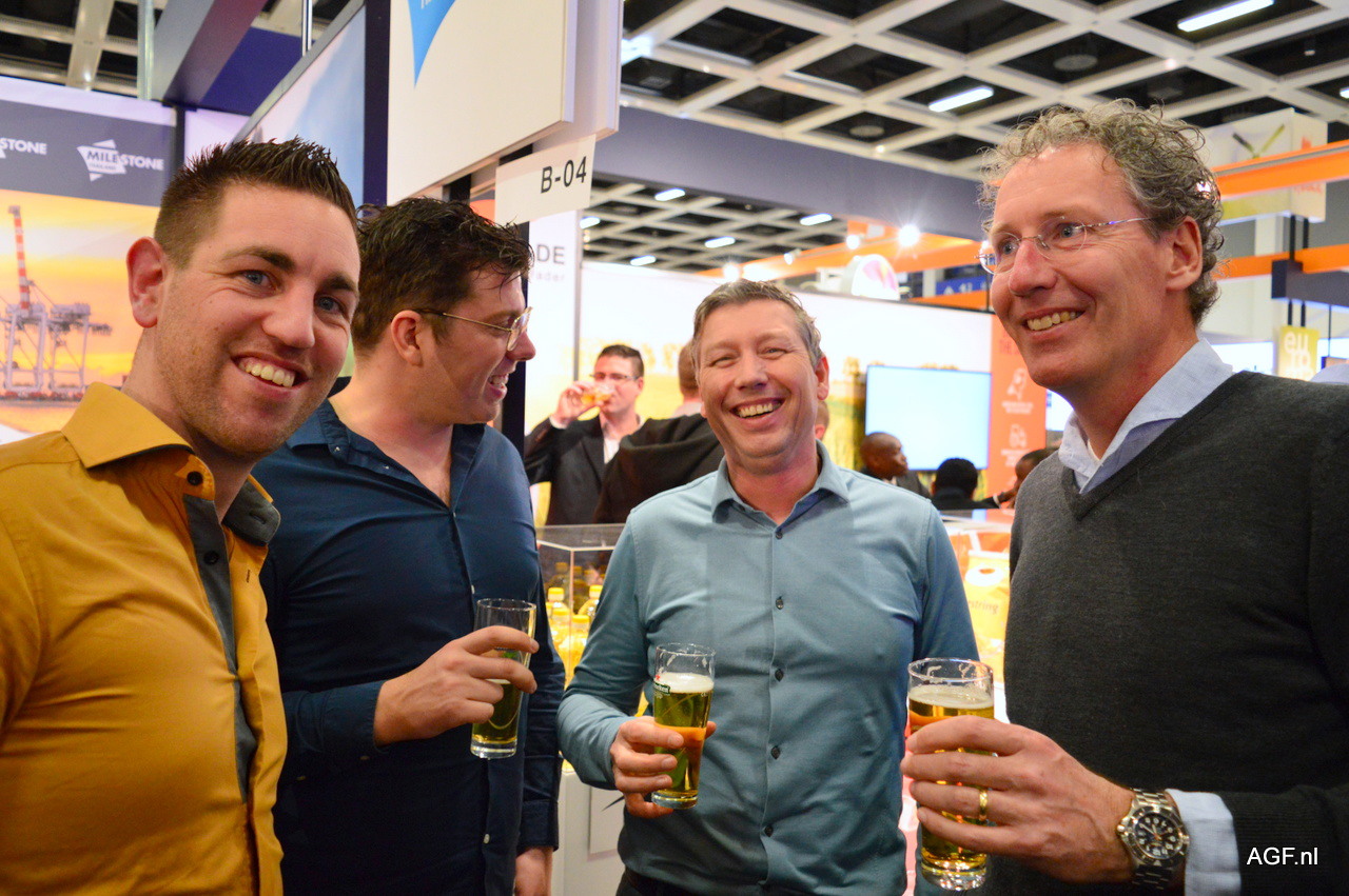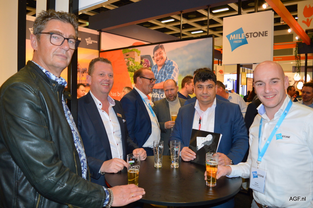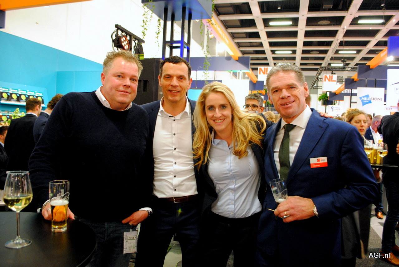 Vier bedrijven maakten van de gelegenheid gebruik Ger van Burik voor zijn laatste Fruit Logistica in het zonnetje te zetten door middel van een Dutch Borrel: Milestone Fresh, FlevoTrade Dronten, BG Door en AGF.nl