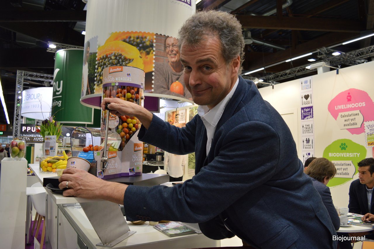 Gert Kögeler tapt wat 'Wild Wonders' (biologische snacktomaatjes) van Nature&More (bij Eosta). Gert: "In online verkopen is bio echt heel groot. We zijn ook erg blij met de plannen van Demeter, zij willen dat in 2022 niks meer in plastic verpakt zal worden. Deze 'NoPlastic'-trend gaat veel harder dan we hadden durven hopen."