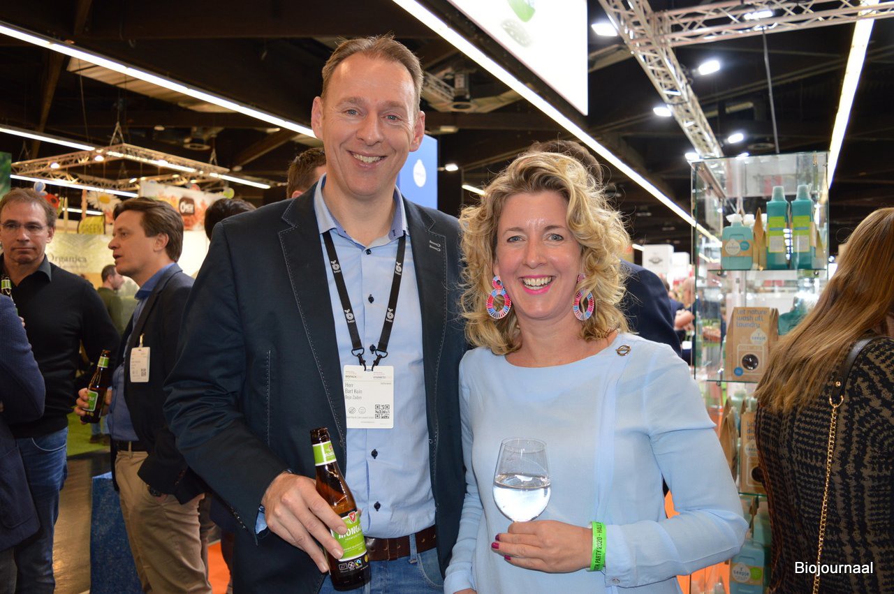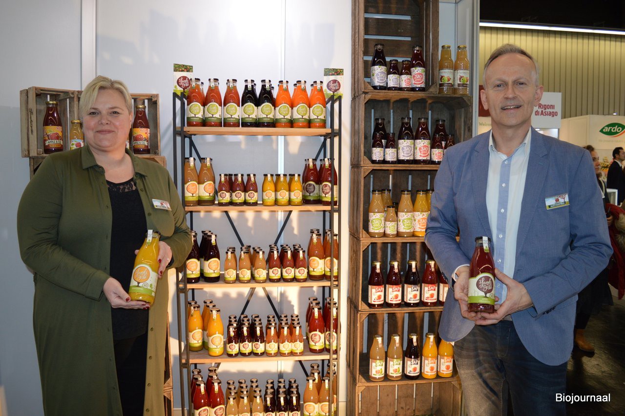 Martine de Jong en Alex Poortinga tonen de bio-sappen van 's Lands Beste. Alex: "Er is steeds meer mogelijk in biologisch."