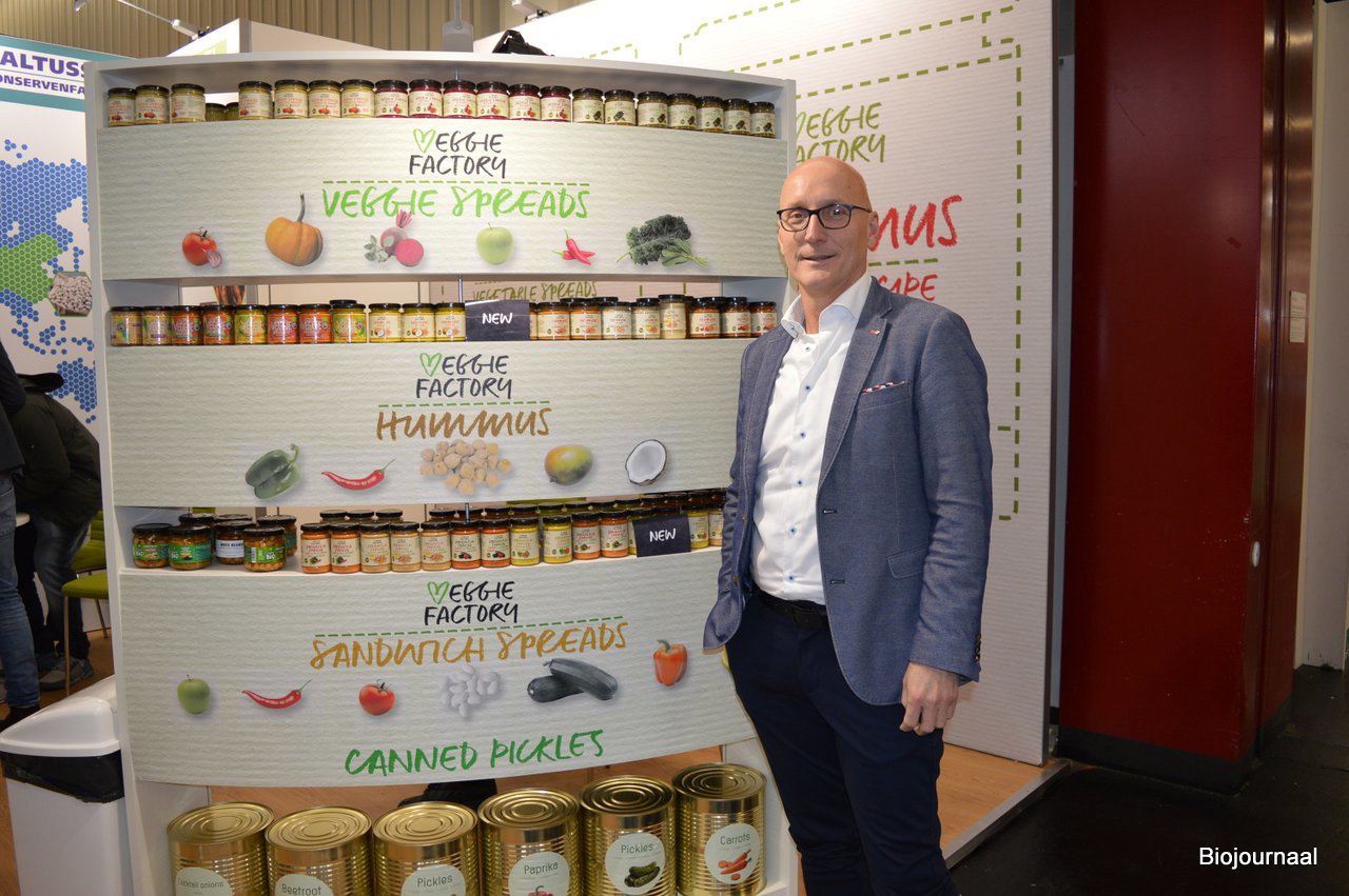 Ruben Bringsken van Baltussen Konservenfabriek met naast hem de nieuwe productlijn van het merk Veggie Factory.