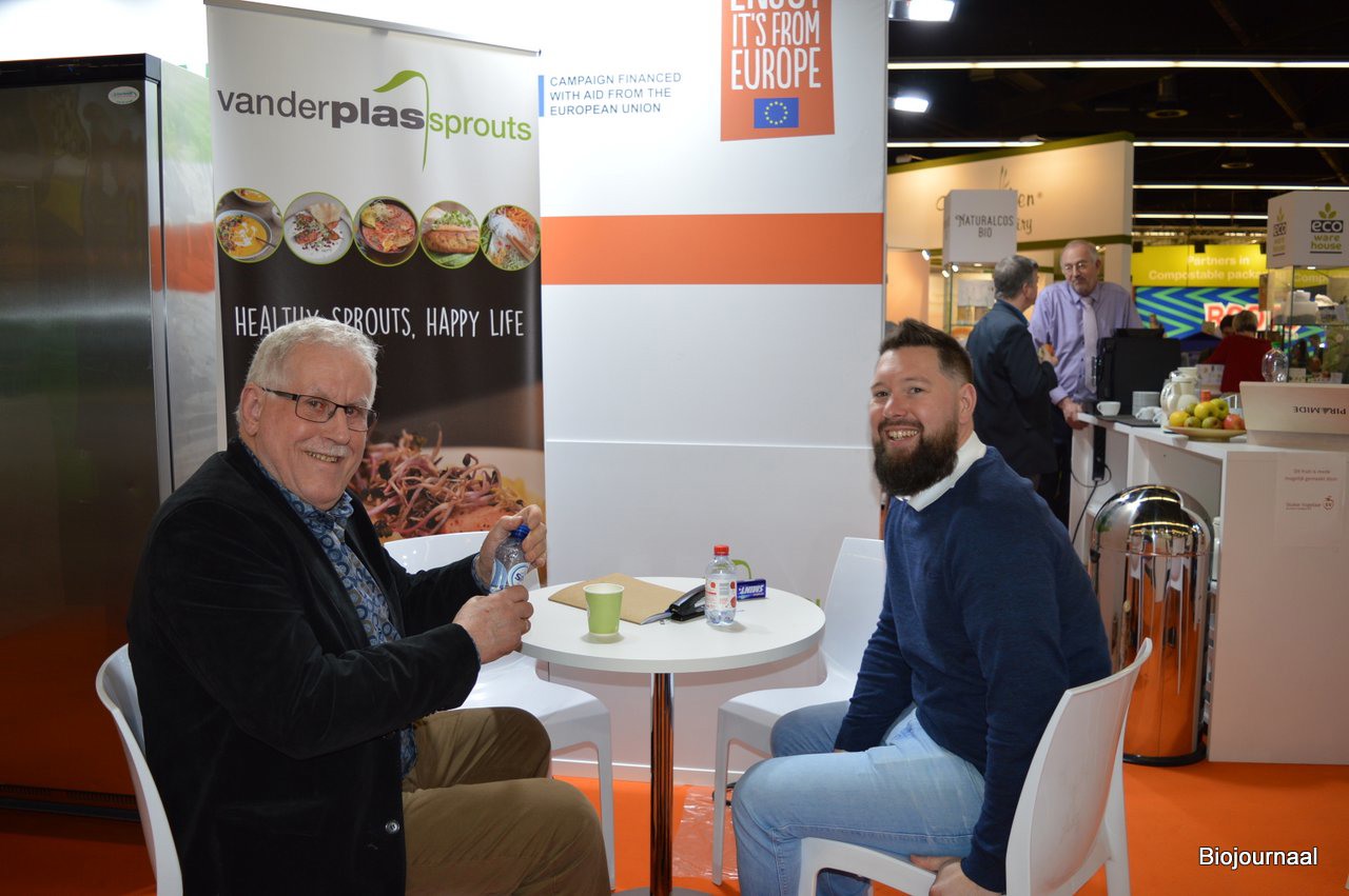 Rechts zit Pepijn van der Plas die alles kon vertellen over de bio-kiemgroenten van Van der Plas Sprouts.