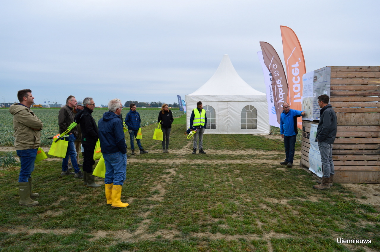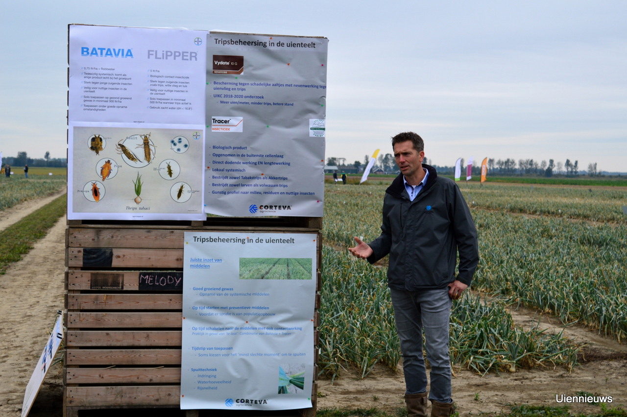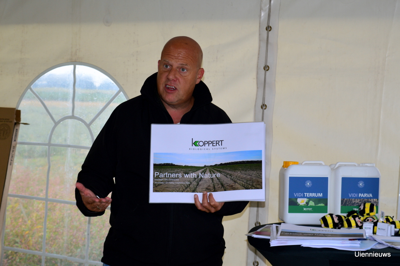 Mark Ermers van Bayer staat samen met Wobbe van der Veen van Corteva. Ze geven toelichting voor het bestrijden van insecten.