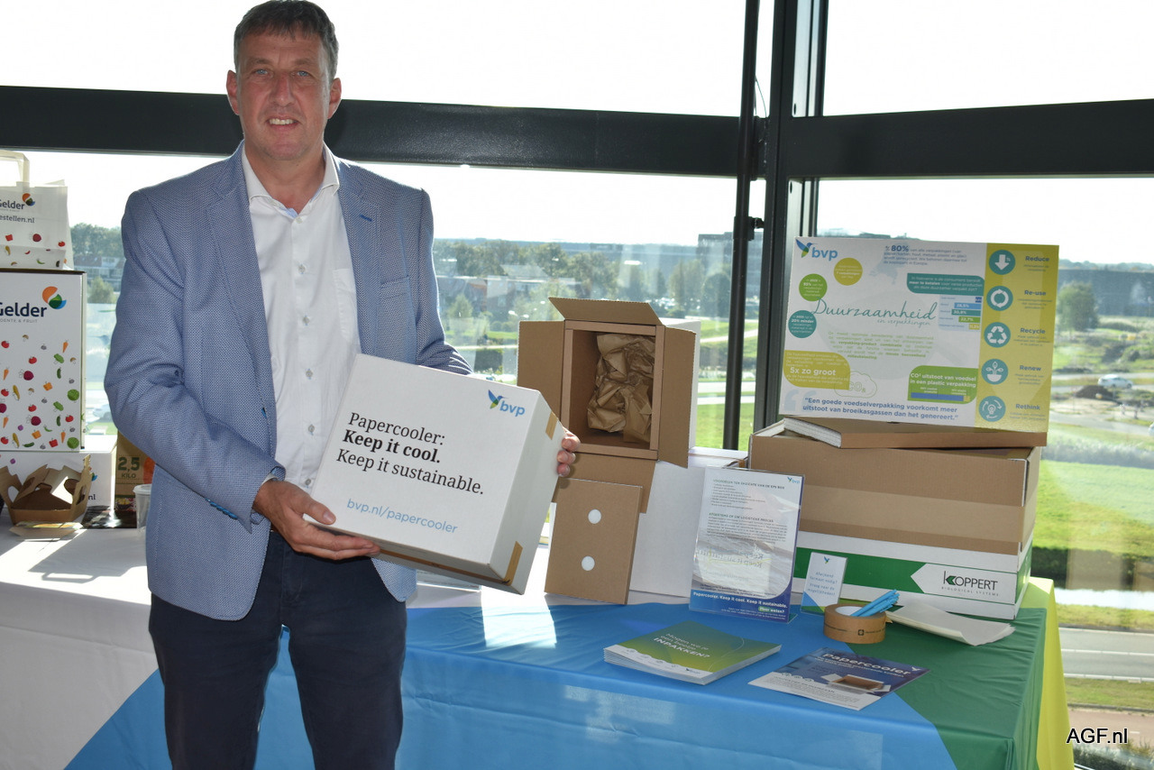 Leen van Bochove van BVP had een innovatie meegenomen: De Papercooler is een volledig recyclebare isolerende verzendverpakking van 100% papier.