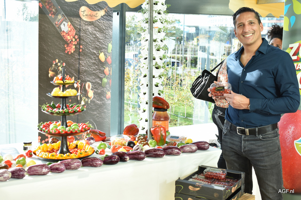 Manuel van Doesburg van Eminent had weer een kleurrijk assortiment meegebracht, variërend van de tomberries, mini-aubergines, Spaanse Padróns tot Lamuyo-paprika's