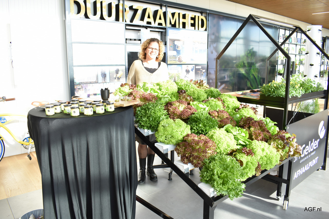 Een beetje fel tegen de zon in, maar Margreet Boer van slakwekerij FromBoer was ook present. Naast de unieke slasoorten had ze ook potjes met sla-pesto meegenomen. Deze pionier in het telen van sla op goten verhuisde onlangs van Ridderkerk naar Dinteloord.