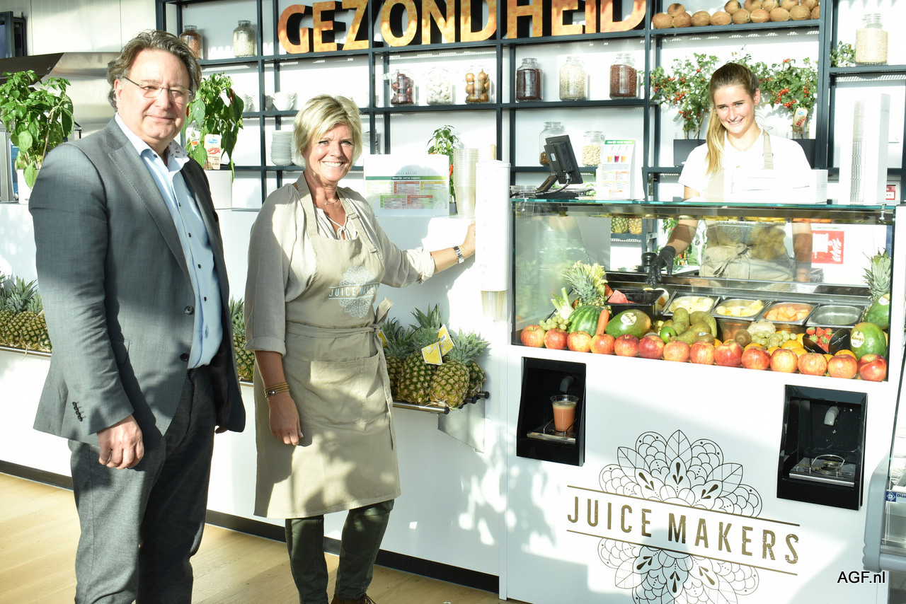 Van Gelder heeft de handen ineengeslagen met Juice Makers voor een nieuw sappenconcept. Van Gelder levert de verse ingrediënten, Juice Makers de machine en zo worden verse, gezonde en rendabele sappen toegankelijk voor alle ondernemers. Op de foto Luc Philiips en Ingeborg Brosens van Juice Makers