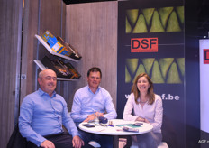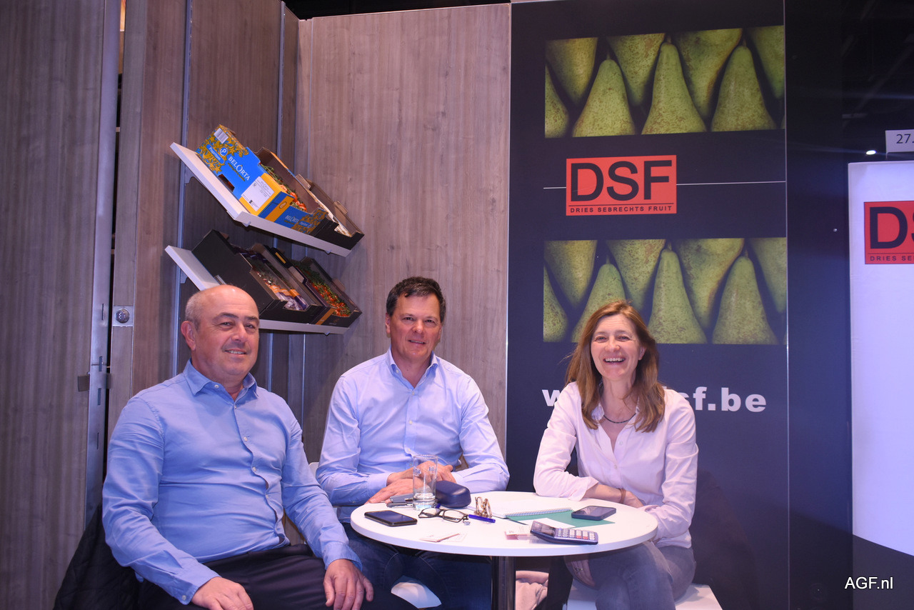 Jan Haegemans, Dries Sebrechts en Veronique Vanherle van DSF rusten uit na een voortvarende dag. Het bedrijf is gespecialiseerd in Belgische peren en heeft een zware tijd achter de rug met het conflict in Oekraïne en recent de vorst. “We hopen hier mooie nieuwe relaties te kunnen vinden”, aldus Jan.