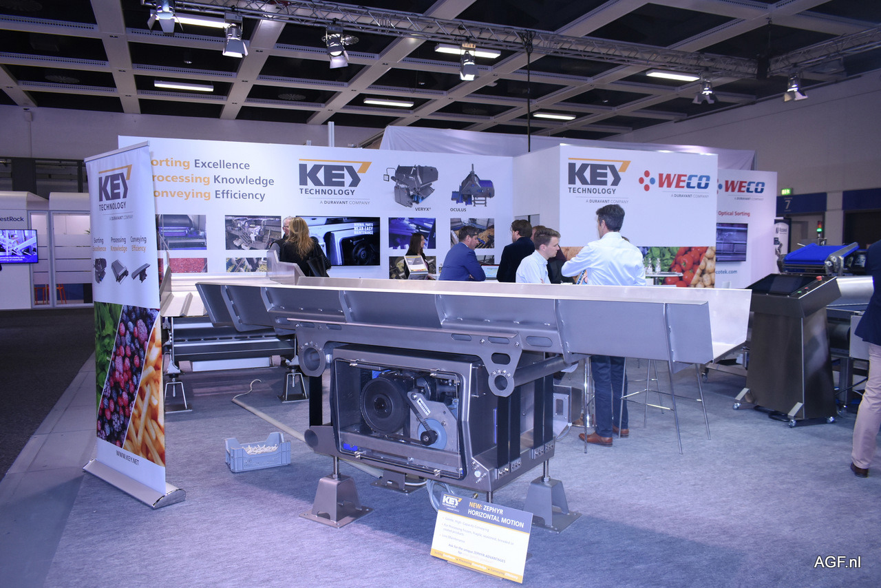 Op de stand van Key Technology was het hele dagen door volop drukte voor het verkoopteam. Paradepaardje van het bedrijf op de beurs was de nieuwe Zephyr horizontal motion conveyor. De machine voor de verwerking van diepgevroren groenten en fruit onderscheidt zich, volgens hen, in gebruiksgemak en de minimalisering van onderhoud.