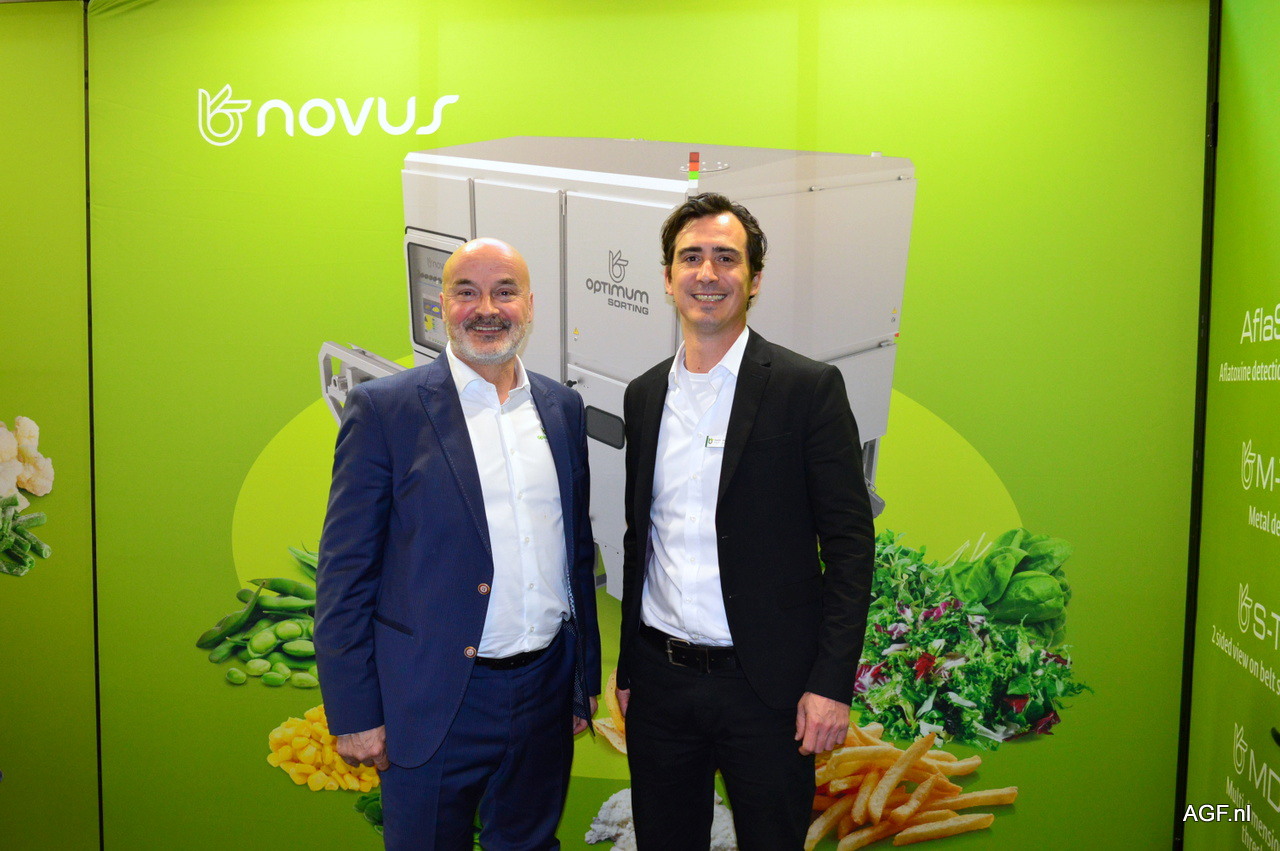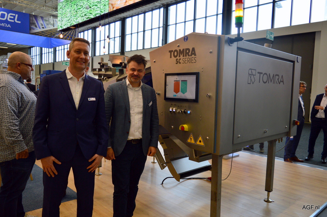 Kris de Smet en Karel Strubbe van Tomra Processed Food. Ze staan bij de nieuwe Tomra 5C. Deze machine is ontwikkeld om giftig onkruid tussen de groenten en fruit vandaan te halen. Verder vierde het bedrijf op de beurs haar 50ste verjaardag en werd de nieuwe marketingstrategie onthuld.