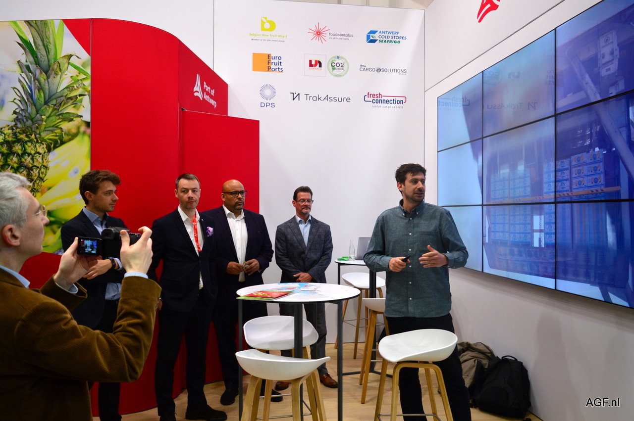 Foodcareplus presenteerde, samen met TrakAssure en Dockflow, tijdens het persmoment op de stand van Port of Antwerp haar nieuwe tracker. Met de goedkope tracker kan de hele reis van containers worden gevolgd en de goederen gecontroleerd. Zo heeft men altijd zicht op de producten gedurende het hele transporttraject.