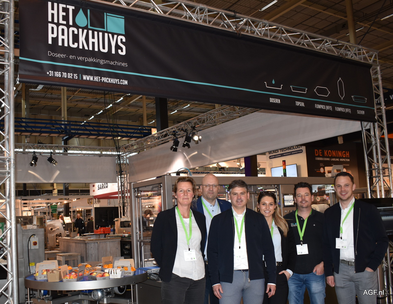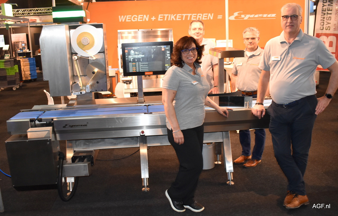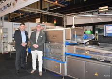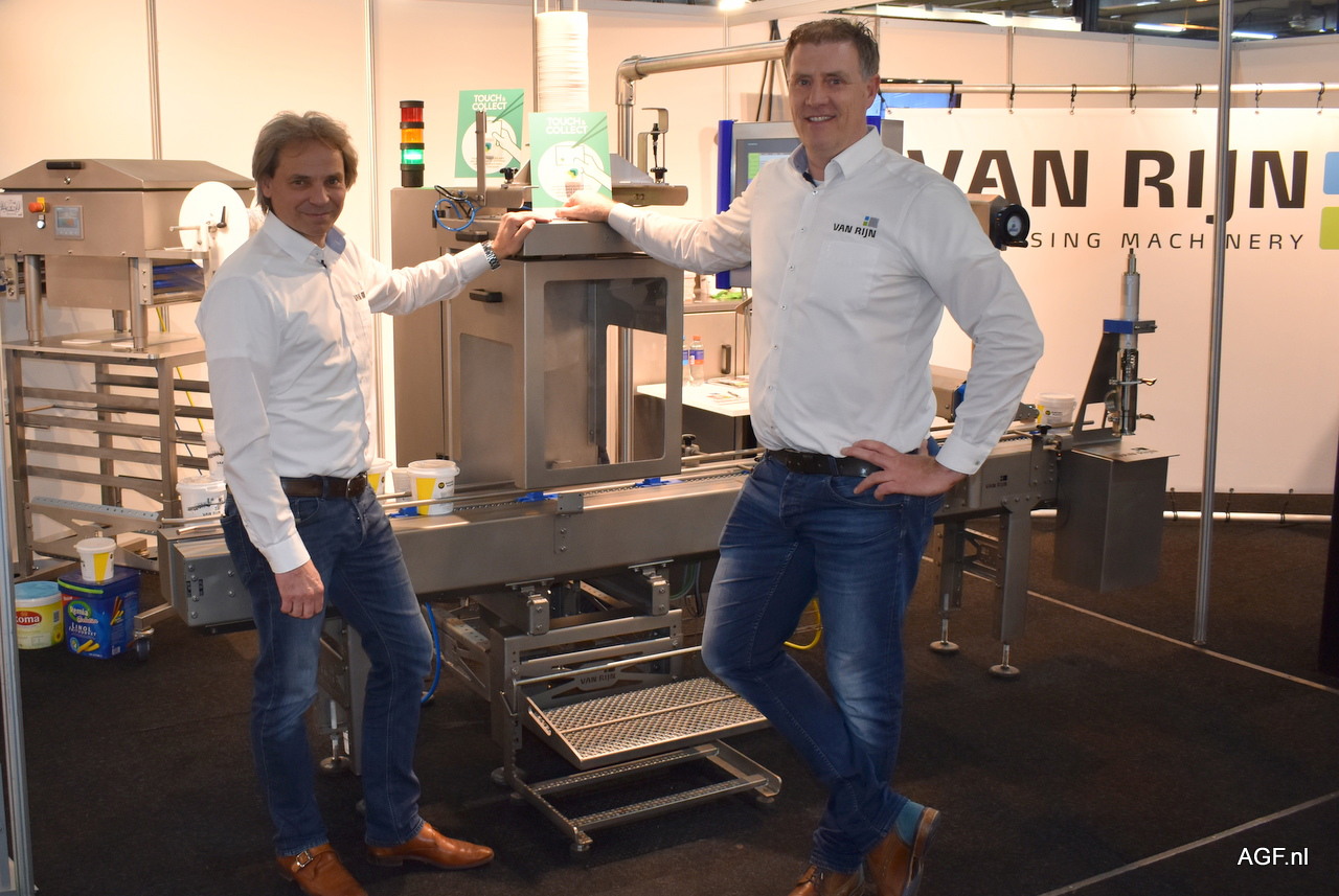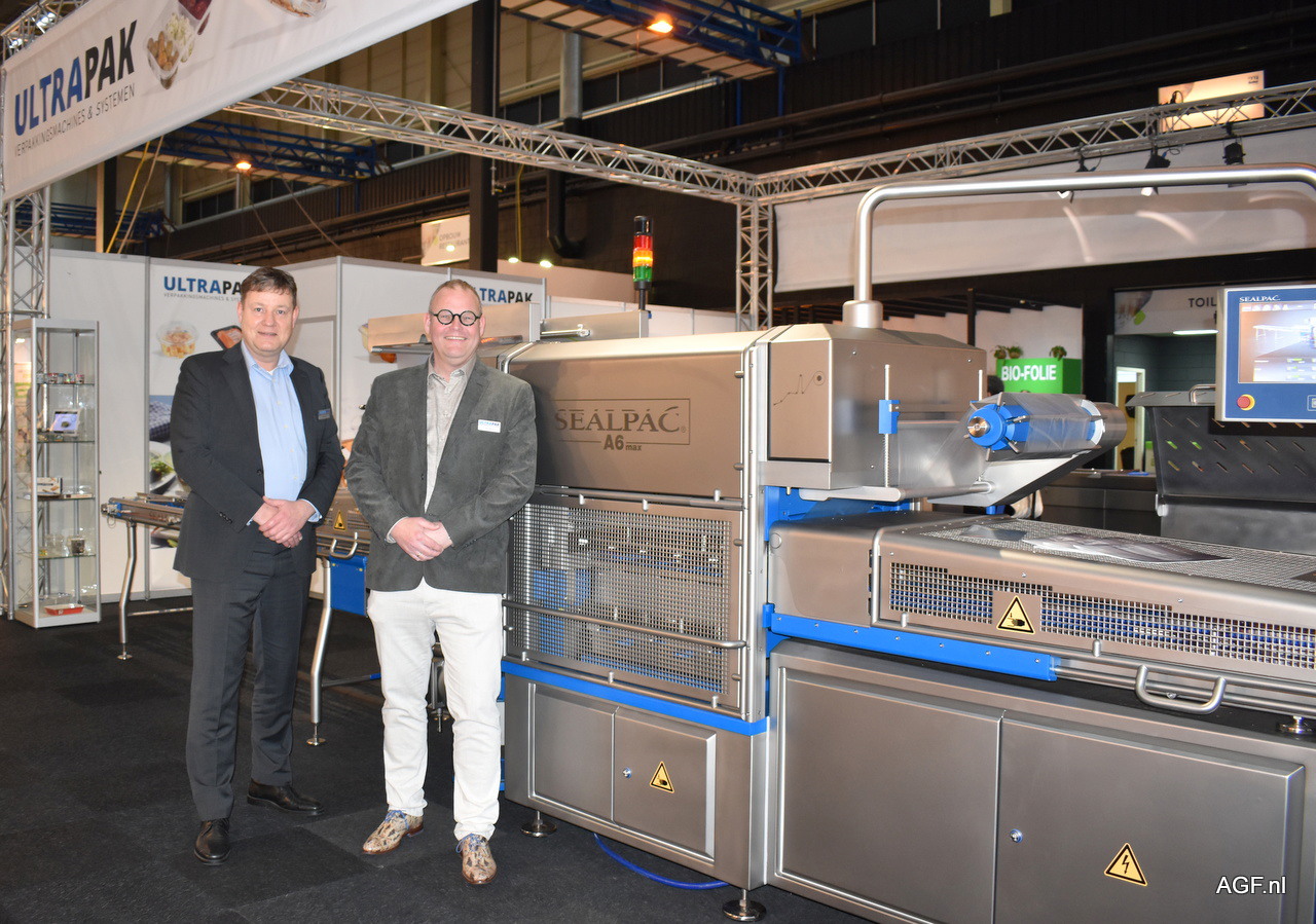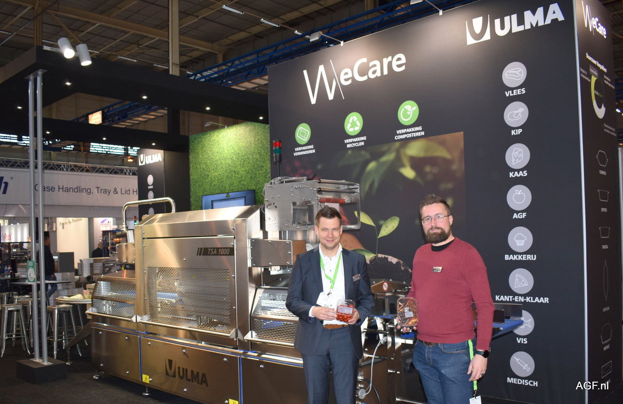 Roy Hofstee en Douwe Coster van UlmaOp de stand stond de Topsealer TSA 1000 die ook geschikt is voor zomerfruit. De machine heeft een hoge snelheid tot 25 cyclussen wat neerkomt op zo'n 150 trays per minuut. Rpet, pulp, karton en verschillende schaalhoogtes zijn mogelijk.