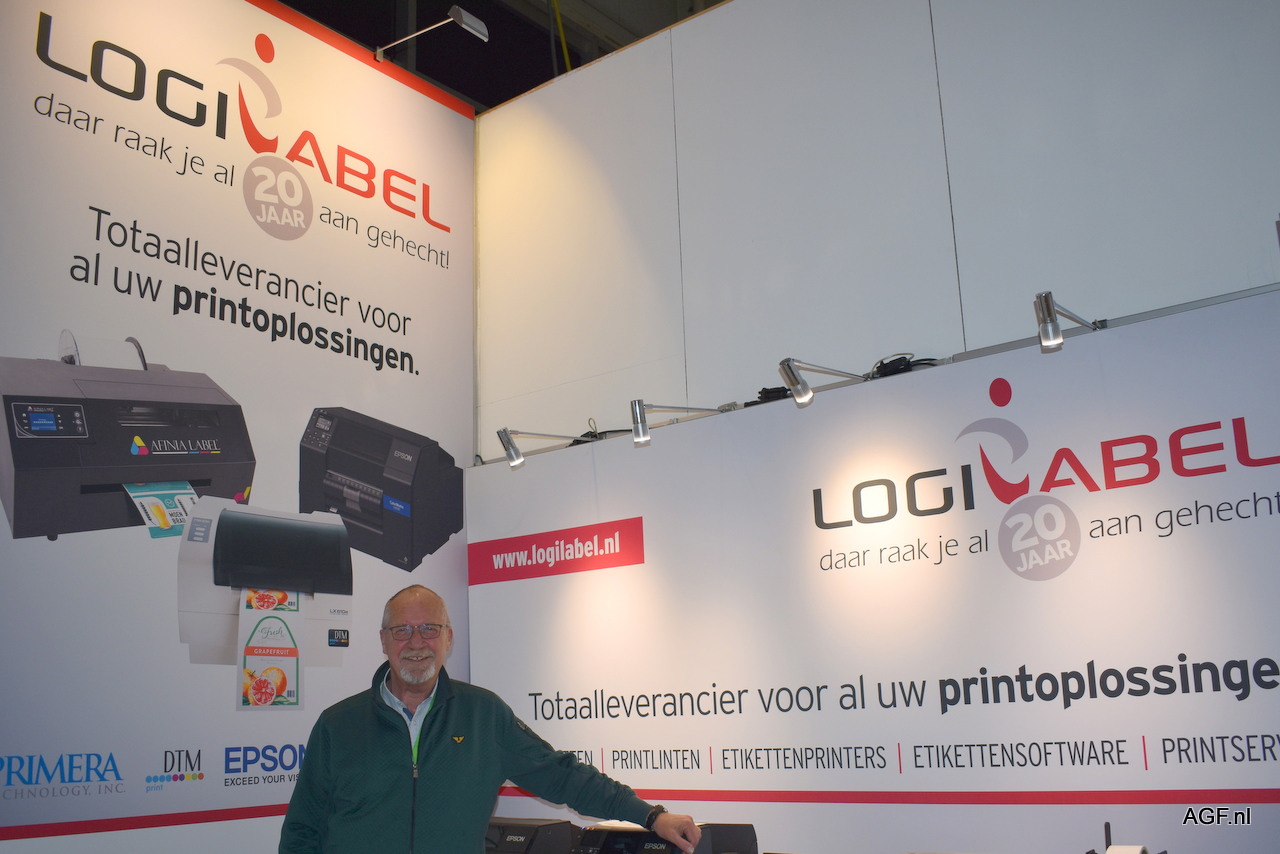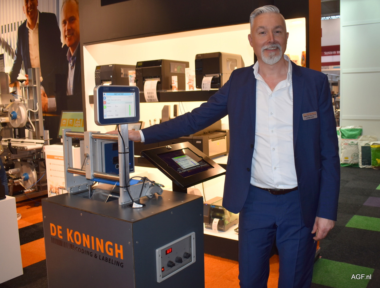 Ludwig Loxley van De Koningh Coding & Labeling. De machine naast hem is de Lynx-1 om topseal te coderen. De info (product/houdbaarheid etc.) wordt direct op de folie geprint. De machine heeft geen perslucht nodig, kan snel printen en weinig wisselen van printerlinten door langformaat lint.